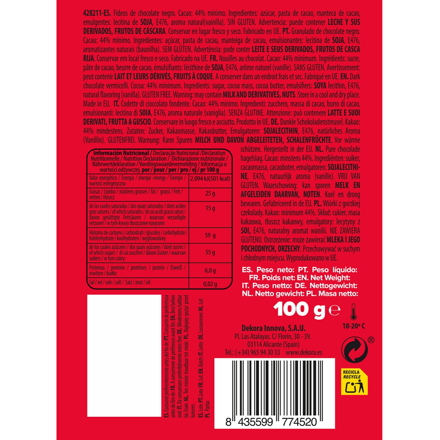 Granulados em fios de chocolate negro 100 g - Dekora