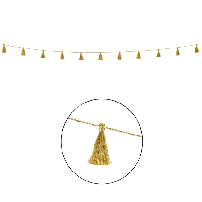 Esta grinalda é composta por um cordão amarelo do qual pendem várias borlas douradas. Fácil de montar e desmontar, este produto combina perfeitamente com as decorações de Natal, de Ano Novo ou de aniversário que encontrará na nossa loja.