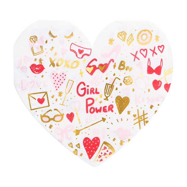 Um pacote de 20 guardanapos de papel em forma de coração, brancos com impressão metálica rosa, vermelha e dourada.
