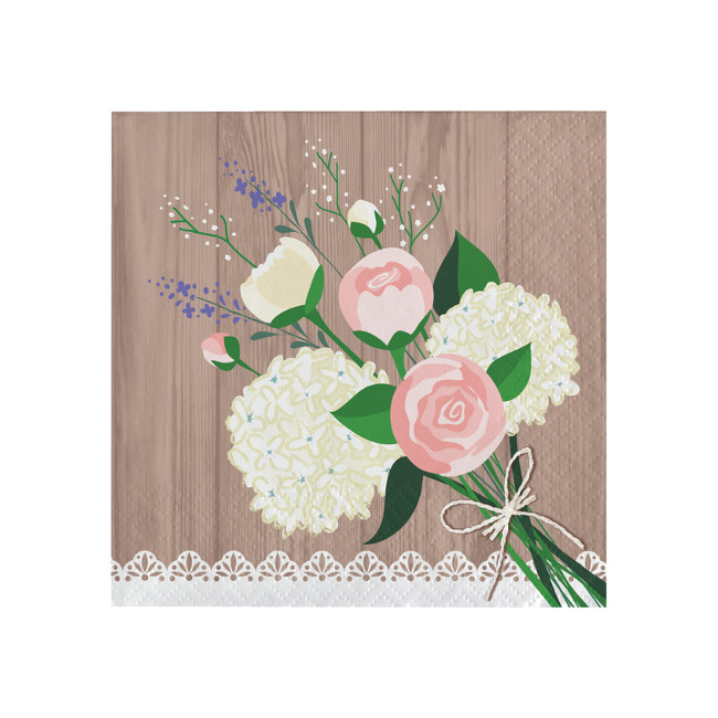 Estes guardanapos de papel apresentam a imagem de um ramo de flores, um padrão de madeira no fundo e um padrão de renda vintage à volta das bordas, para a sua ocasião especial de casamento rústico!