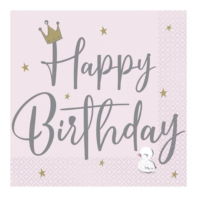 Bonitos guardanapos com as palavras Feliz Aniversário e um pequeno cisne num dos lados.