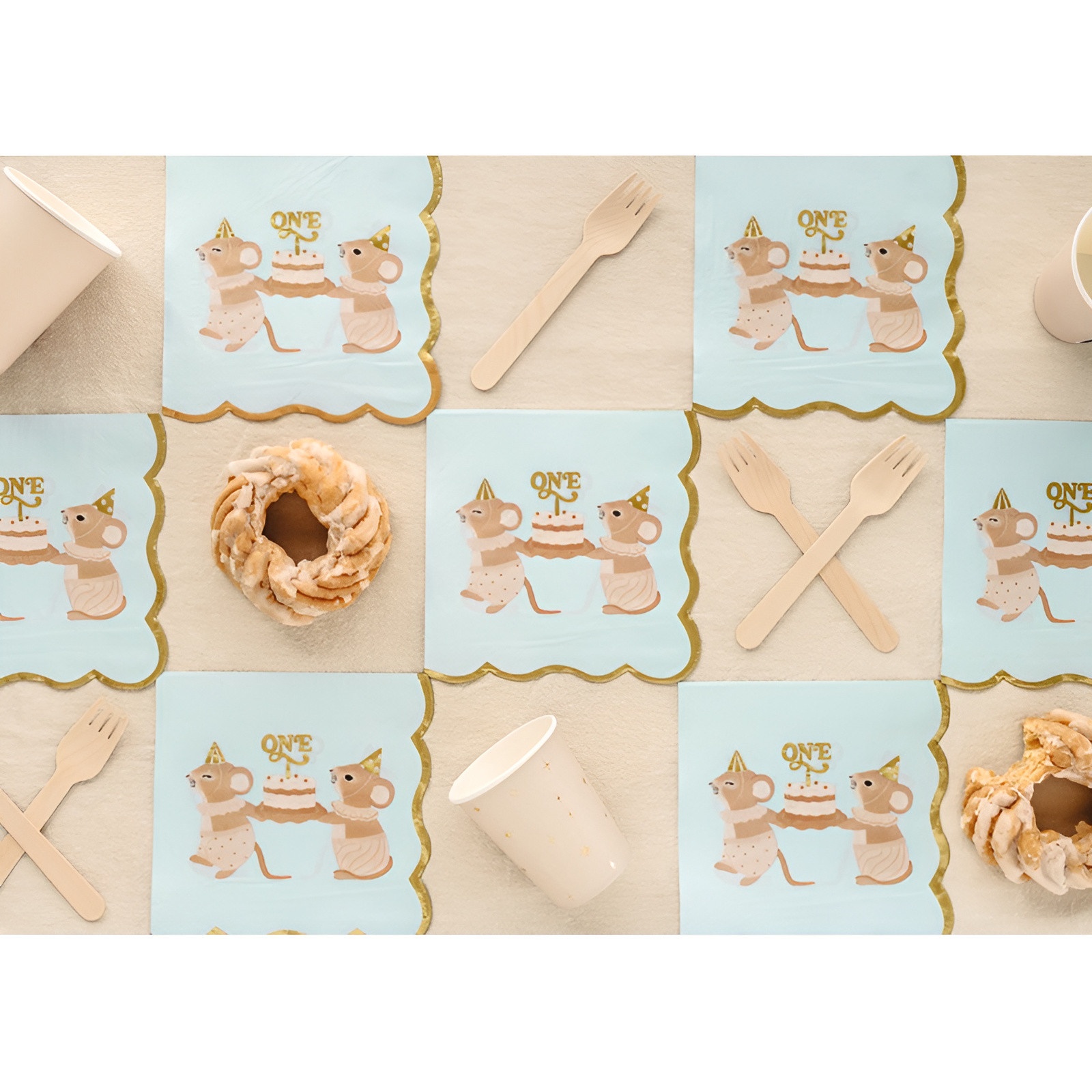 - Encanto infantil: ilustração de ratinhos e a palavra ONE para uma mesa do primeiro aniversário com estilo.