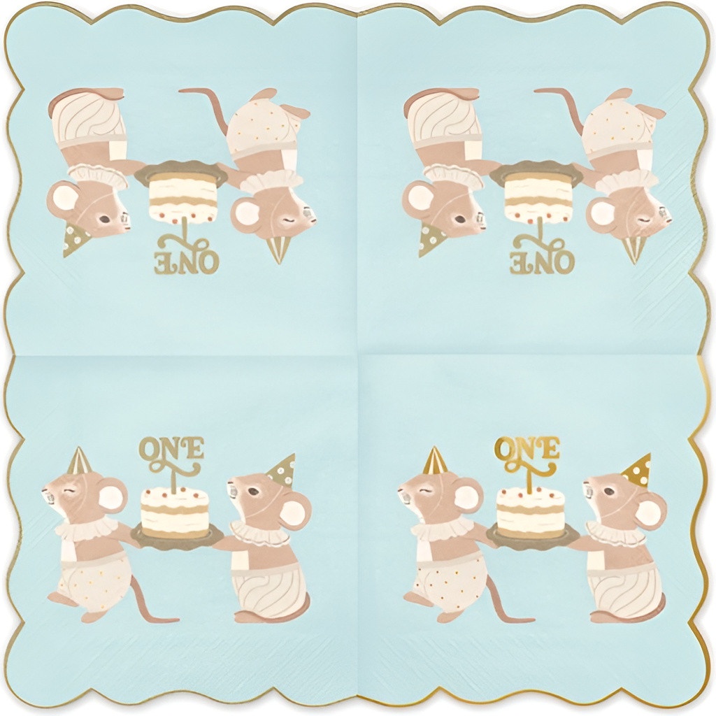 Guardanapos de papel de duas camadas com um terno desenho de ratinhos e a inscrição "ONE" sobre fundo azul. Medidas ao abrir 33 x 33 cm e dobrados 16,5 x 16,5 cm. Design doce e elegante, pensado para celebrar o primeiro aniversário com estilo. Apresentação prática em embalagem compacta, perfeitas para o senhor/a senhora decorar a mesa e combinar com o restante da papelaria de festa.