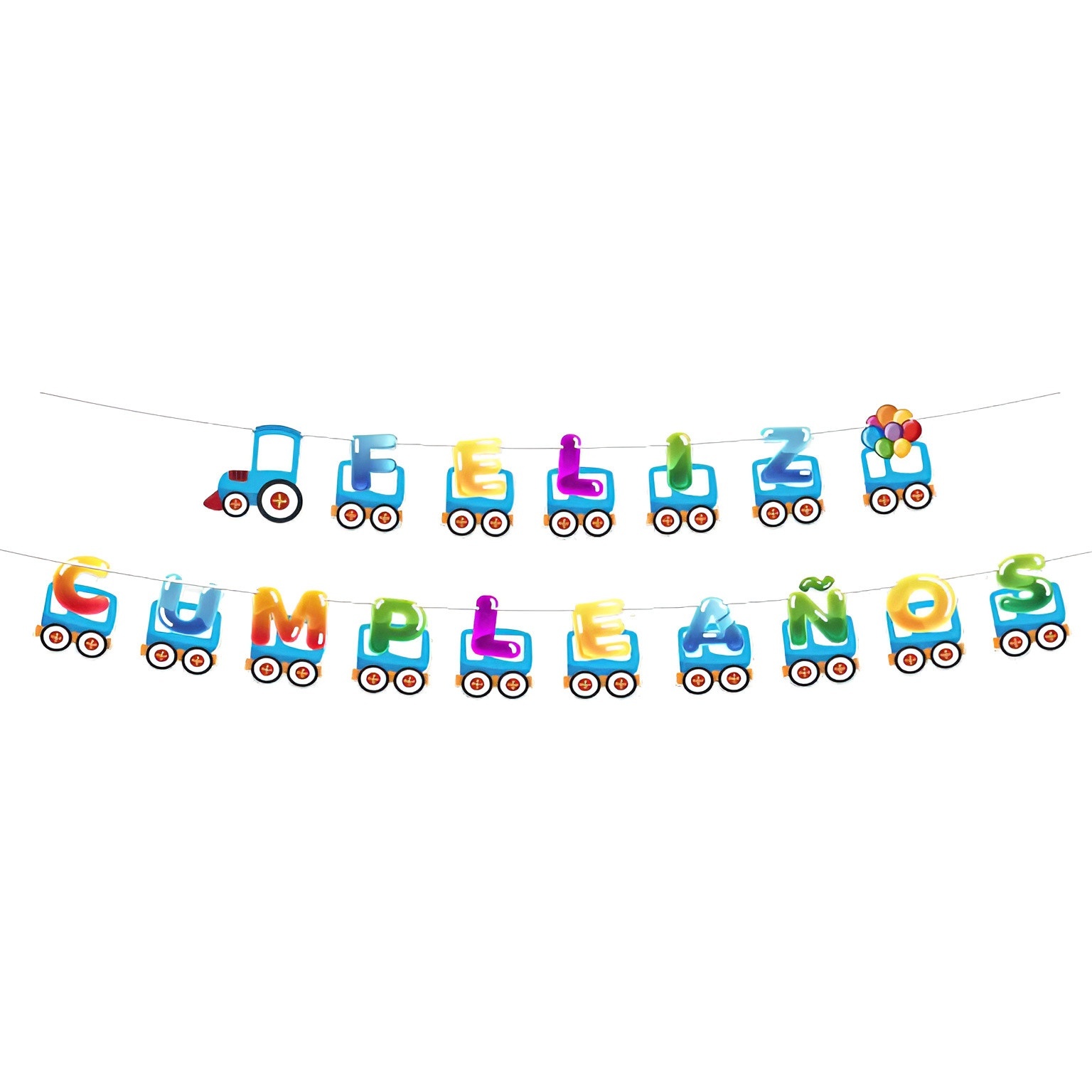 Guirlanda infantil com um encantador design de trenzinho cujas letras formam "Feliz Aniversário", pensada para que o senhor/a senhora celebre com cor e diversão.