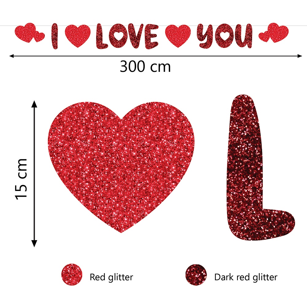Guirlanda "I love you" em papel, com letras e corações recortados em acabamento brilhante. Concebida para criar uma atmosfera romântica no Dia dos Namorados, em jantares íntimos e em celebrações especiais. Comprimento total aproximado de 300 cm e corações com cerca de 15 cm, garantindo presença visível em paredes ou cabeceiras. Leve e fácil de colocar graças à fita de fixação, oferece ao(à) senhor(a) um toque elegante e festivo com a sua cor vermelha e efeito glitter.
