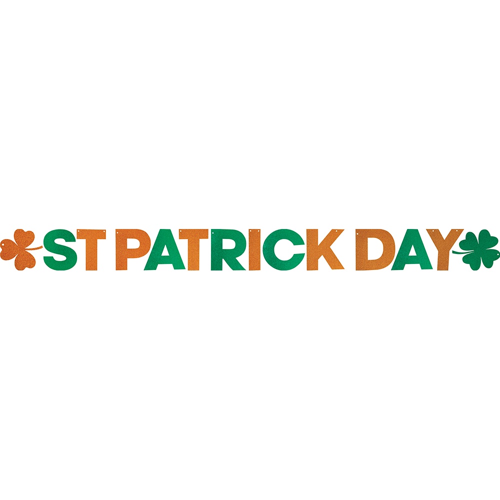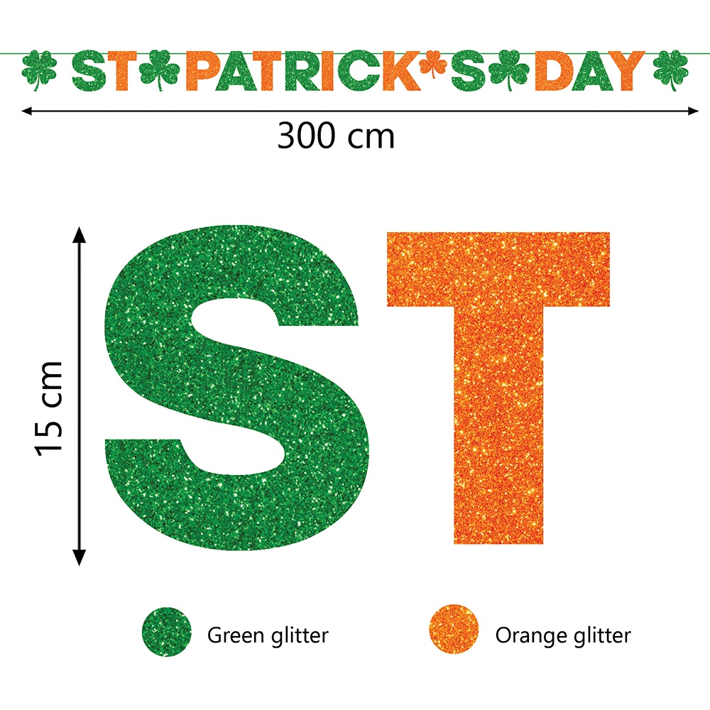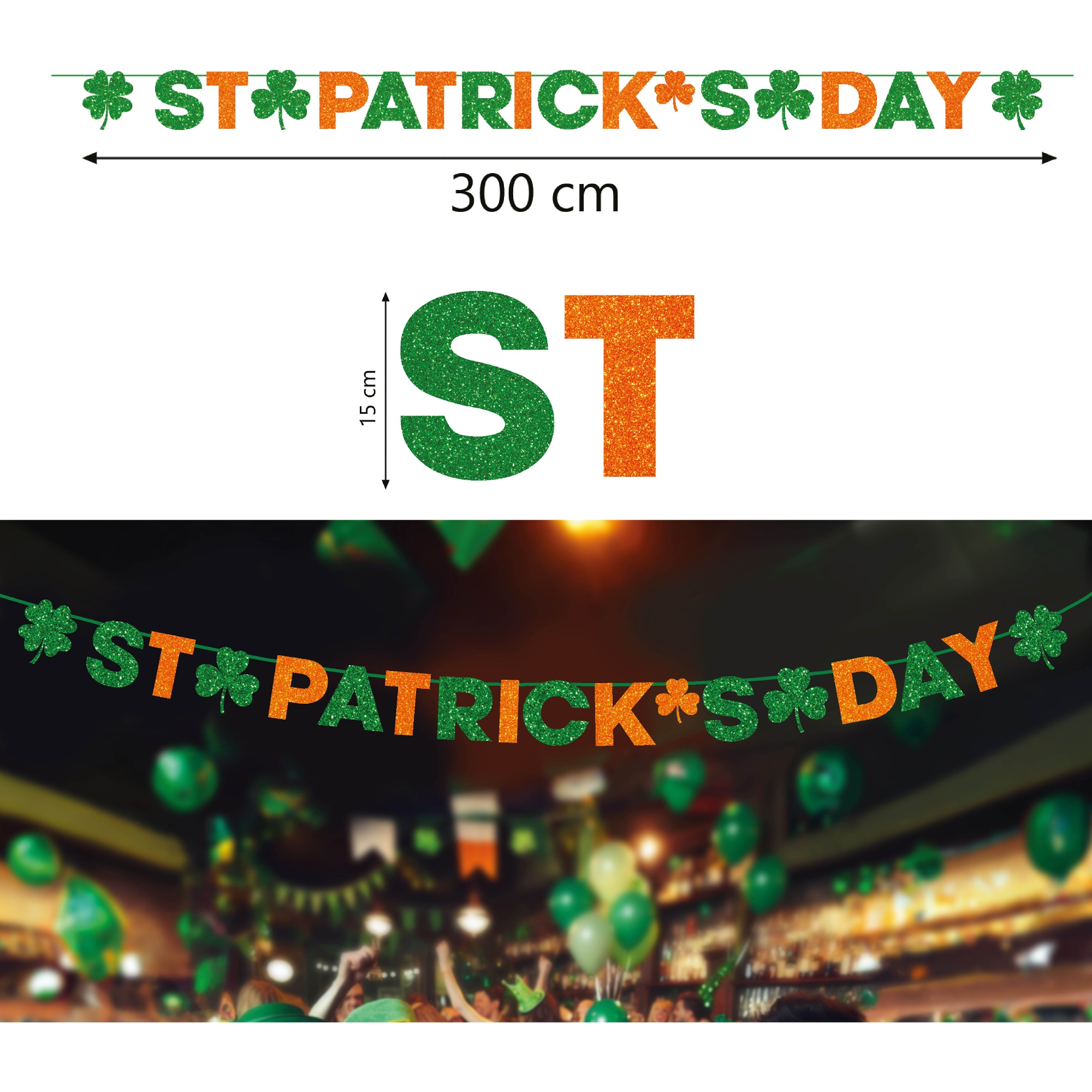 Guirlanda decorativa de 300 cm com temática de São Patrício, composta por letras e trevos que criam um ambiente festivo e marcante.