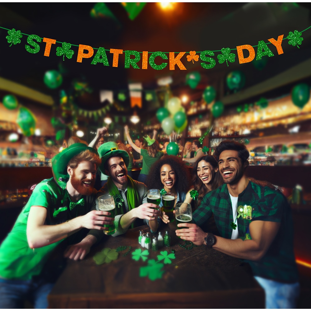 - Motivo visível: letras grandes e trevos decorativos que conferem um aspeto autêntico de São Patrício.