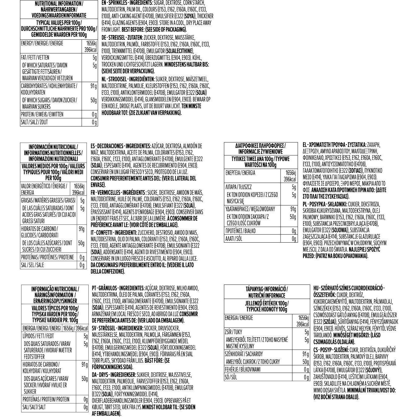 Ingredientes: Açúcar, dextrose, amido de milho, maltodextrina, óleo de palma, corantes (E153, E162, E160a, E160c, E133, E100), antiaglomerante (E470b), emulsionante (E322, soja), espessante (E414), agentes de revestimento (E904, E903).