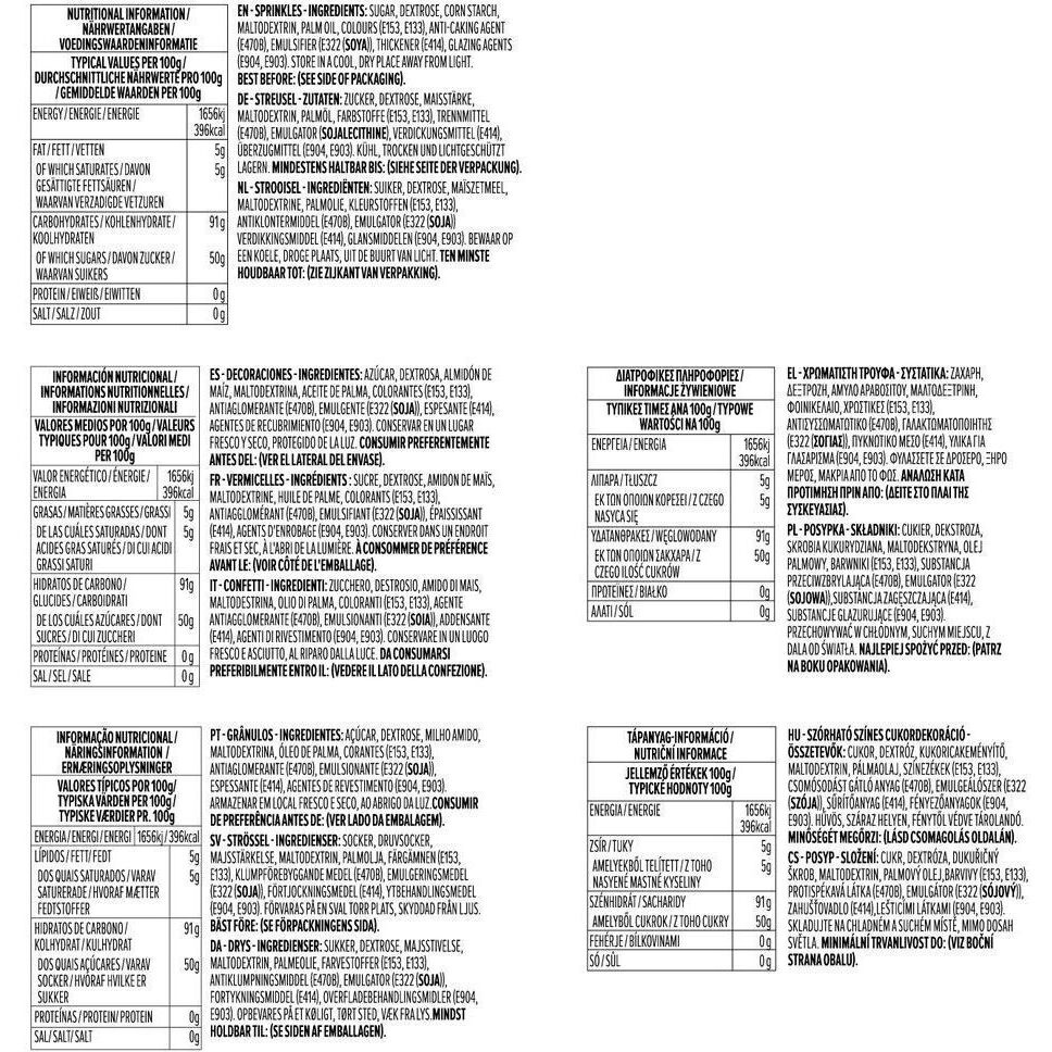 Ingredientes: Açúcar, dextrose, amido de milho, maltodextrina, óleo de palma, corantes (E153, E133), antiaglomerante (E470b), emulsionante (E322(soja)), espessante (E414), agentes de revestimento (E904, E903).