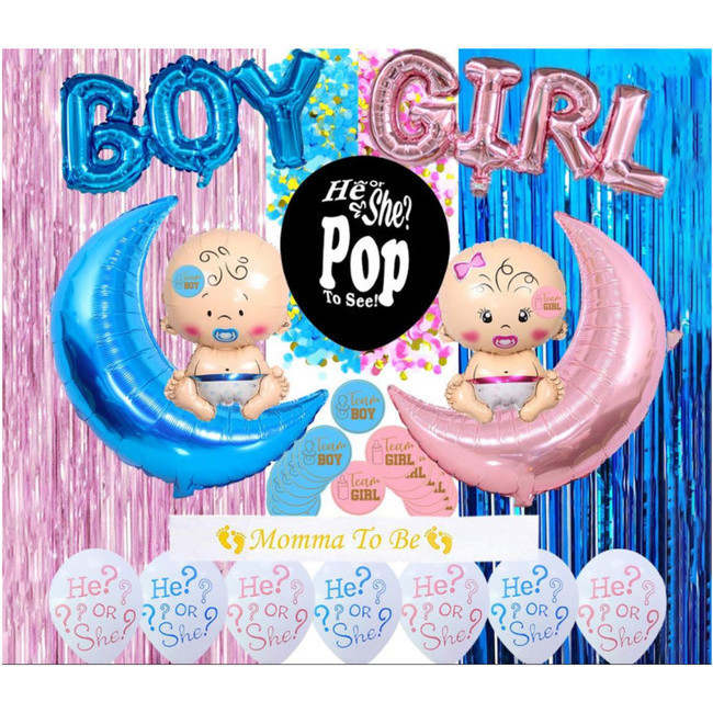 Um pack sem faltar nenhum detalhe para fazer uma festa para descobrir o sexo do bebé.