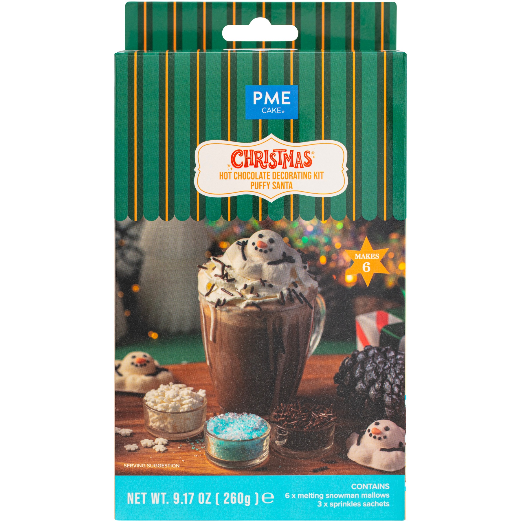 - Inclui: 6 nuvens de boneco de neve derretido e 3 pacotes com confeitos (flocos de neve, fios de chocolate e confeitos azuis e brancos).