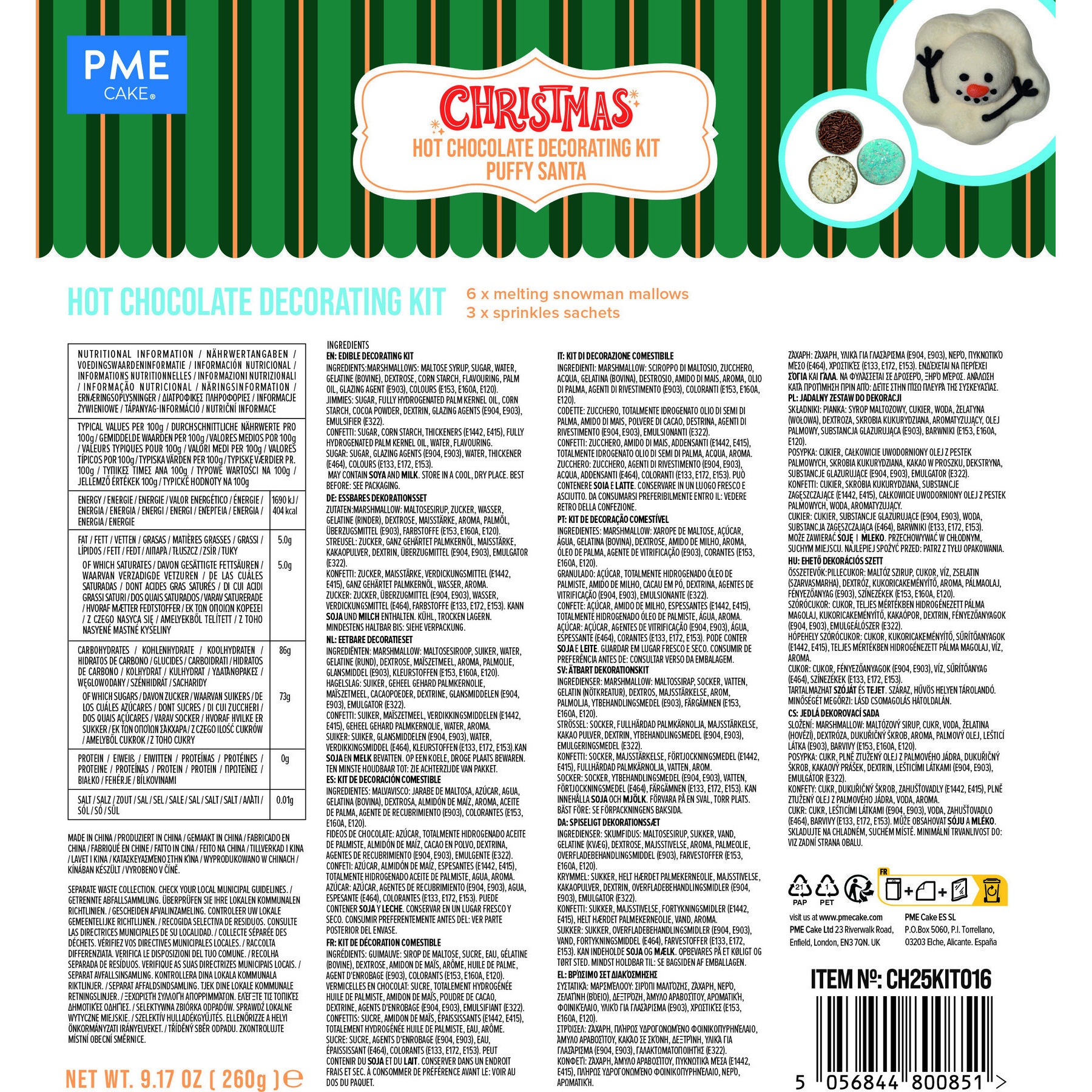 Ingredientes marshmallow: xarope de maltose, açúcar, água, gelatina (bovina), dextrose, amido de milho, aroma, óleo de palma, agente de revestimento (E903), corantes (E153, E160A, E120).