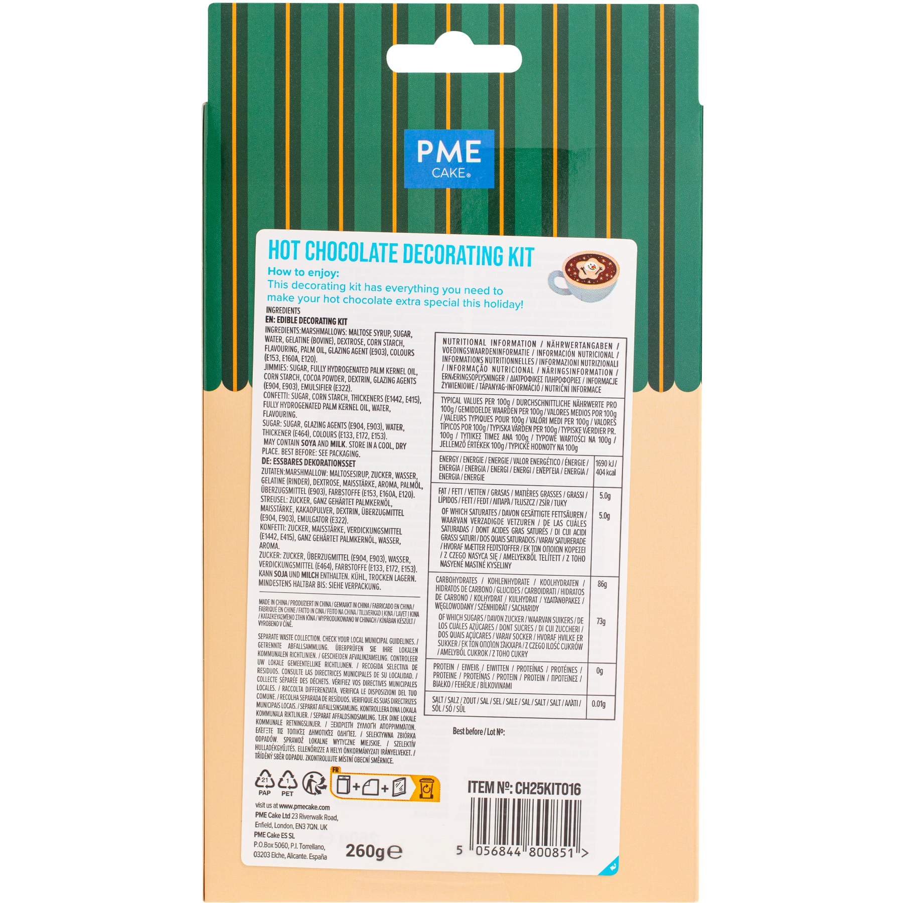 Ingredientes confetes: açúcar, amido de milho, espessantes (E1442, E415), óleo de palma totalmente hidrogenado, água, aroma.