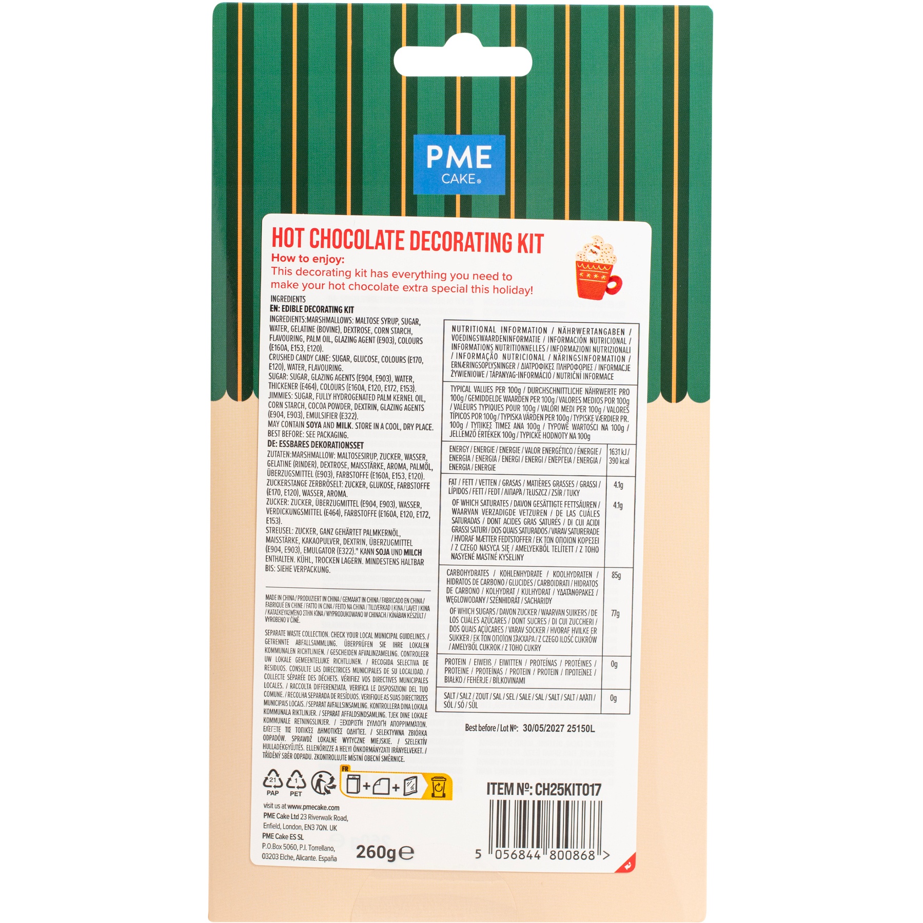 Ingredientes de marshmallow: xarope de maltose, açúcar, água, gelatina (bovina), dextrose, amido de milho, aroma, óleo de palma, agente de revestimento (E903), corantes (E160A, E153, E120).