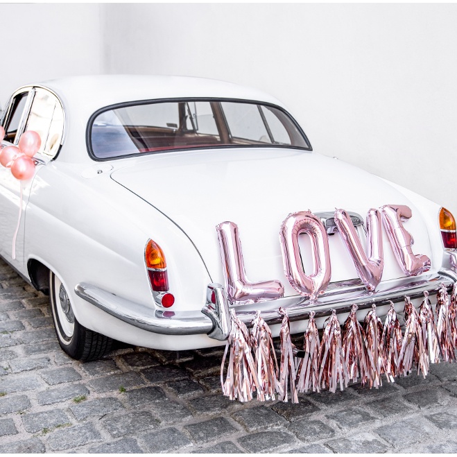 Embalagem com 4 balões de 35 cm em alumínio e cor-de-rosa dourado, com as letras da palavra amor que terá de encher com ar. Grinalda de borlas, cada pompom com 30 cm de altura, em papel cor-de-rosa dourado, que terá de montar e prender com 12 metros de fio transparente incluídos no pacote.