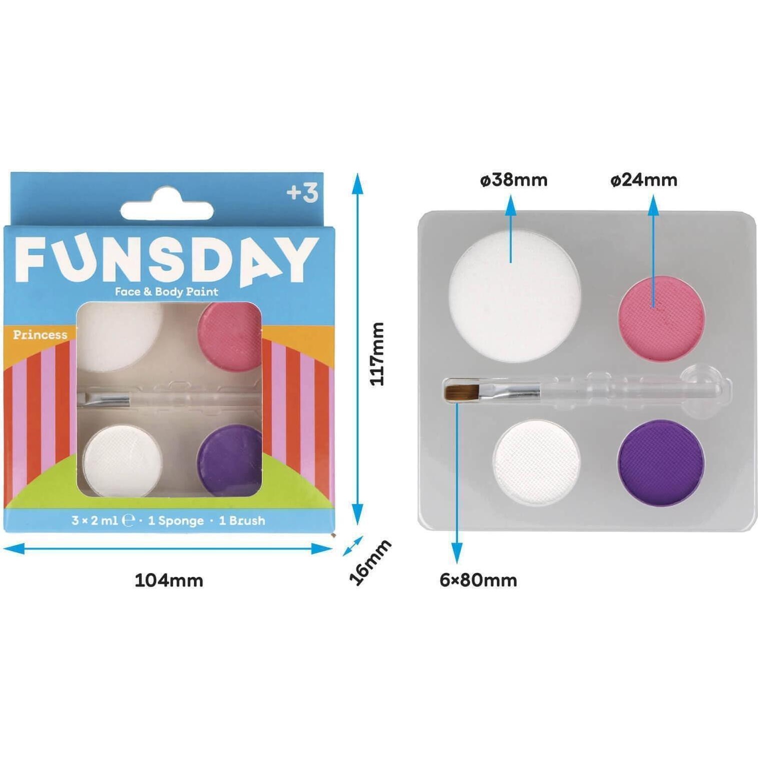 - Kit com 3 tintas faciais nas cores lilás, branco e rosa, com pincel e esponja. Fáceis de aplicar e proporcionam um resultado vibrante e duradouro; perfeitas para caracterização, festas, festivais, carnaval ou Halloween.