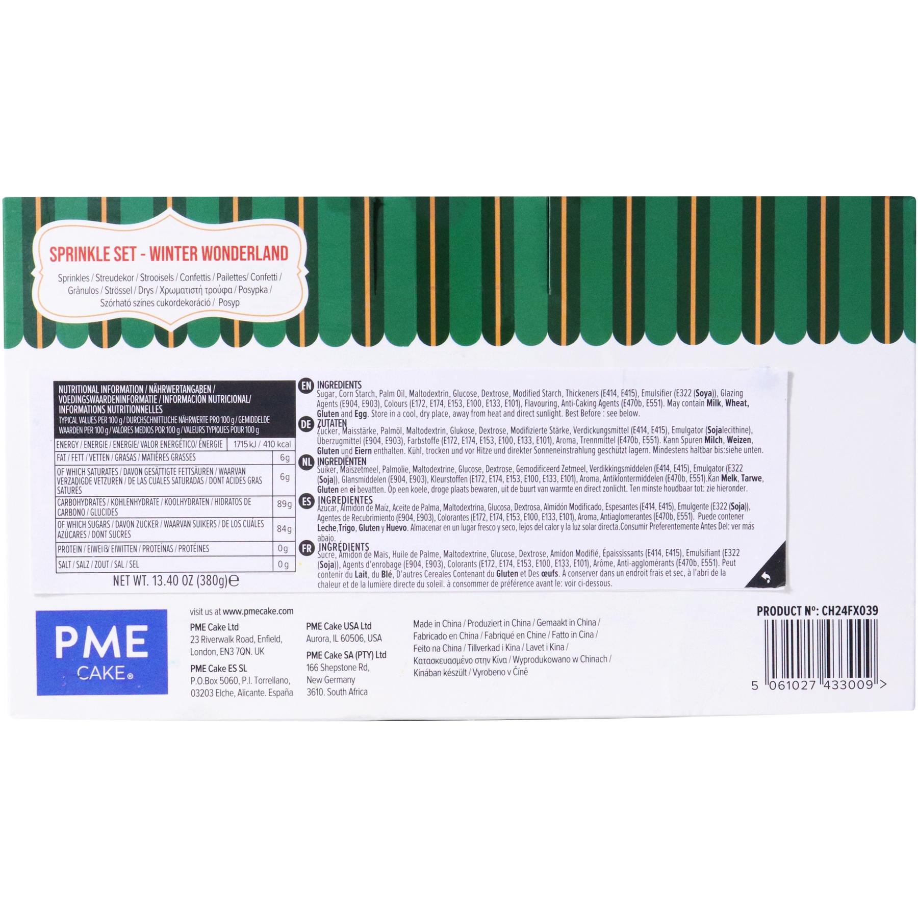 - 4 frascos de granulado com um tema prateado, branco e azul, com uma mistura mágica de confeitos em forma de floco de neve com pérolas, açúcar de decoração e confeitos coloridos.