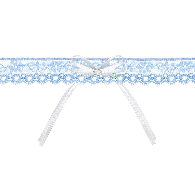 Esta liga apresenta uma faixa principal de renda azul, decorada com ondas e motivos inspirados na natureza. Tem um laço duplo branco no meio.