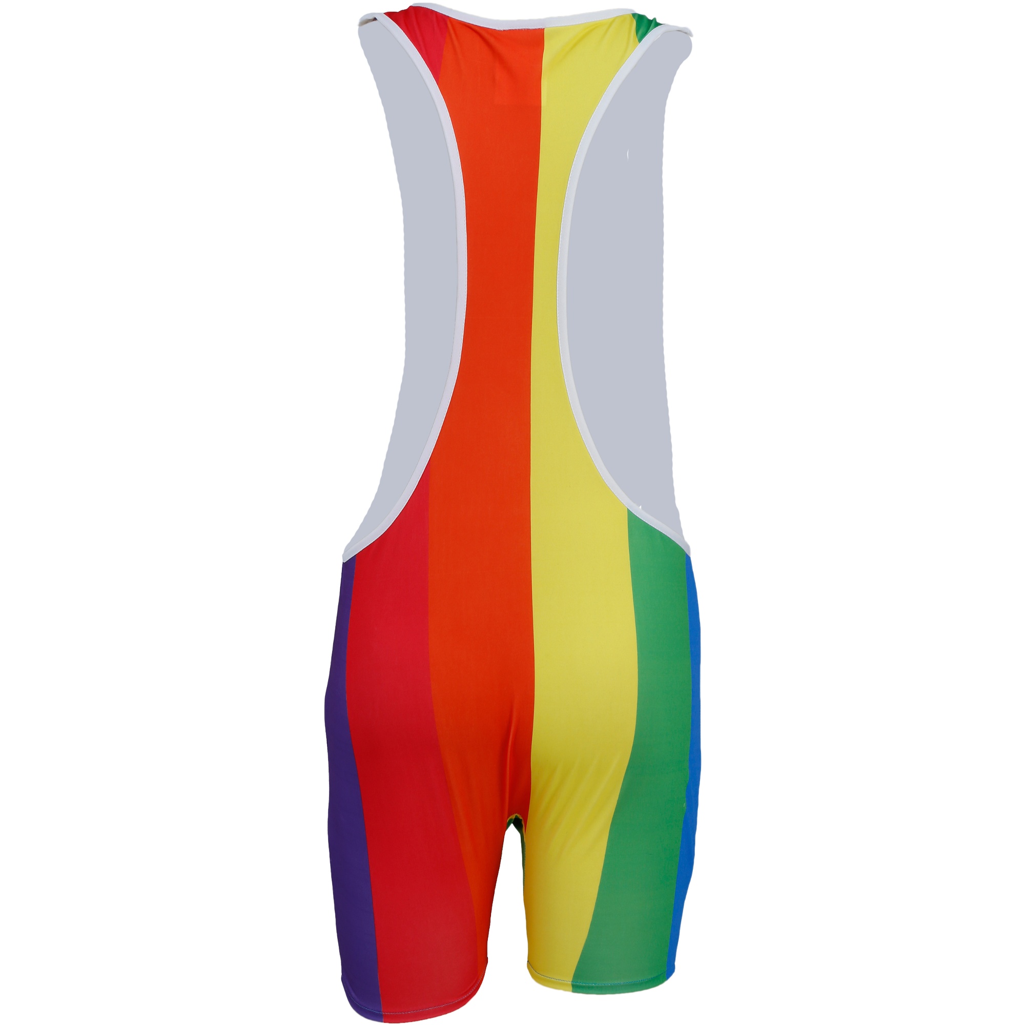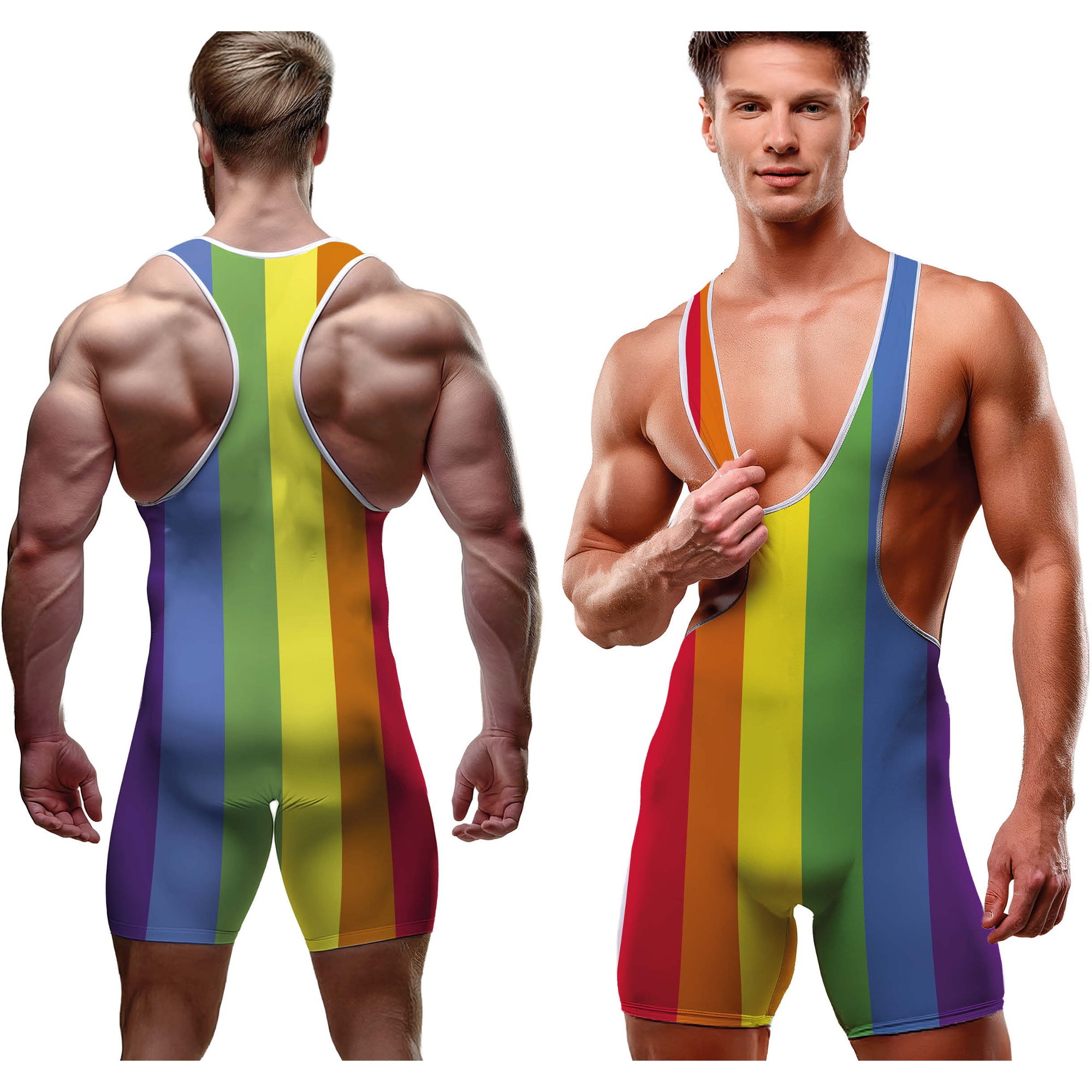 Macacão de uma peça com faixas verticais nas cores do arco-íris para exibir o orgulho LGBT. Apresenta corte tipo singlet justo que realça a figura masculina e costas estilo racer com alças largas. Confeccionado em poliéster elástico e leve para proporcionar conforto e liberdade de movimentos. Perfeito para o senhor exibir um visual marcante e colorido em qualquer celebração.