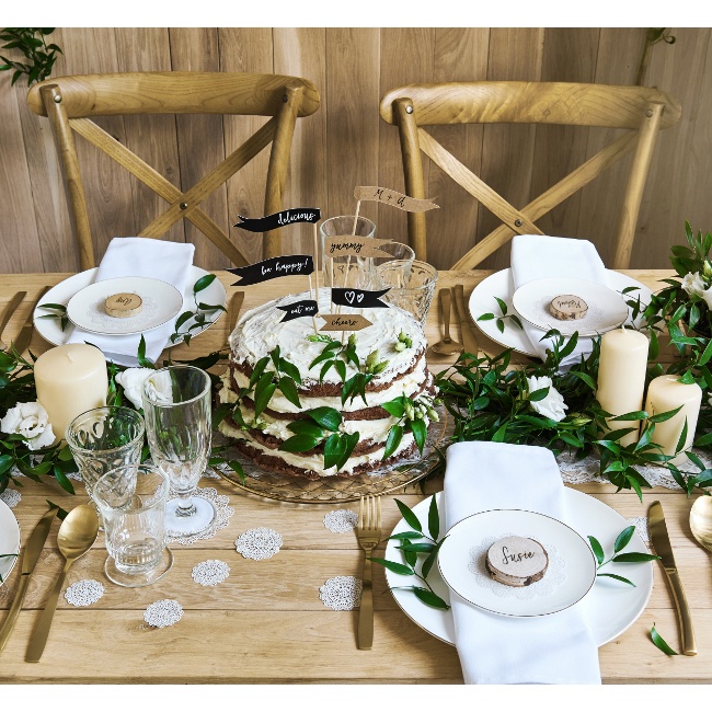 Esta embalagem contém fatias de madeira originais, que pode colocar na sua mesa de festa como marcadores de lugar. Pode escrever nelas o número da mesa ou qualquer outra mensagem que lhe ocorra.