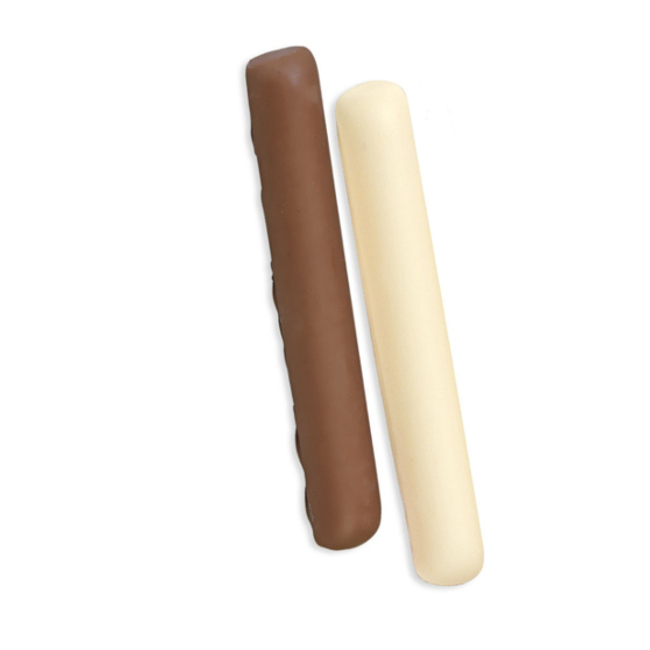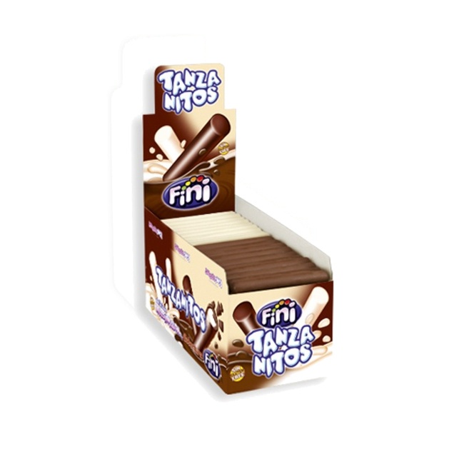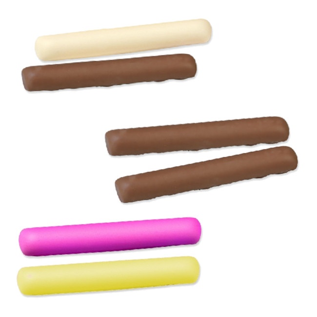 Ingredientes preto e branco: cobertura de substituo de chocolate (açúcar, gordura vegetal hidrogenada (palma), cacau desengordurado em pó, emulsionantes: lecitina de girassol, E492, aromatizantes, xarope de glucose e frutose, açúcar, água, gelatina, humidificante: E420, aromatizantes. Pode conter vestígios de frutos secos e soja.