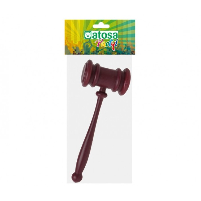Este martelo de plástico rígido tem uma cor avermelhada que imita a madeira envernizada. As suas formas e decorações são uma reprodução fiel dos autênticos martelos utilizados nas salas de audiências jurisdicionais tão populares no cinema e na televisão.