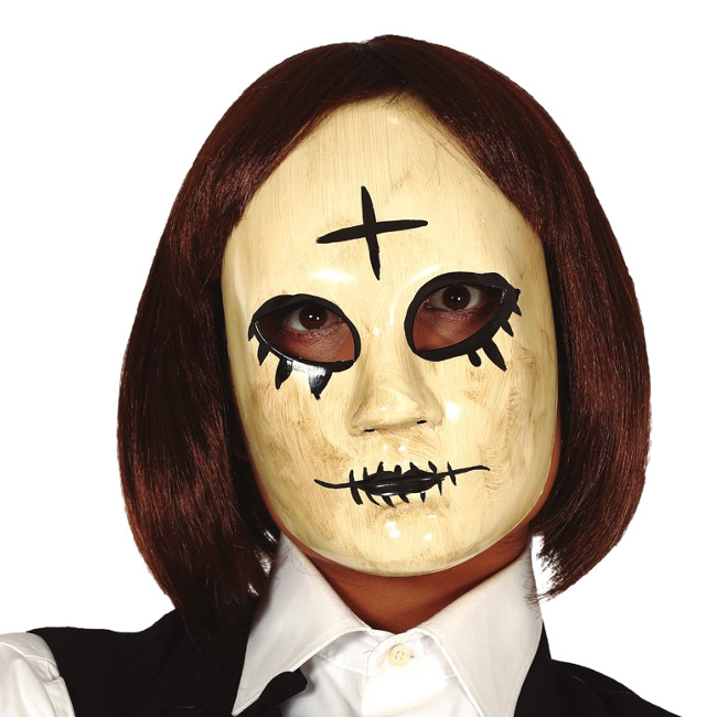 Esta máscara feminina caracteriza-se pelo seu design oriental com um aspeto de porcelana e traços faciais compostos por pinceladas de caneta preta, com uma cruz preta na testa.
