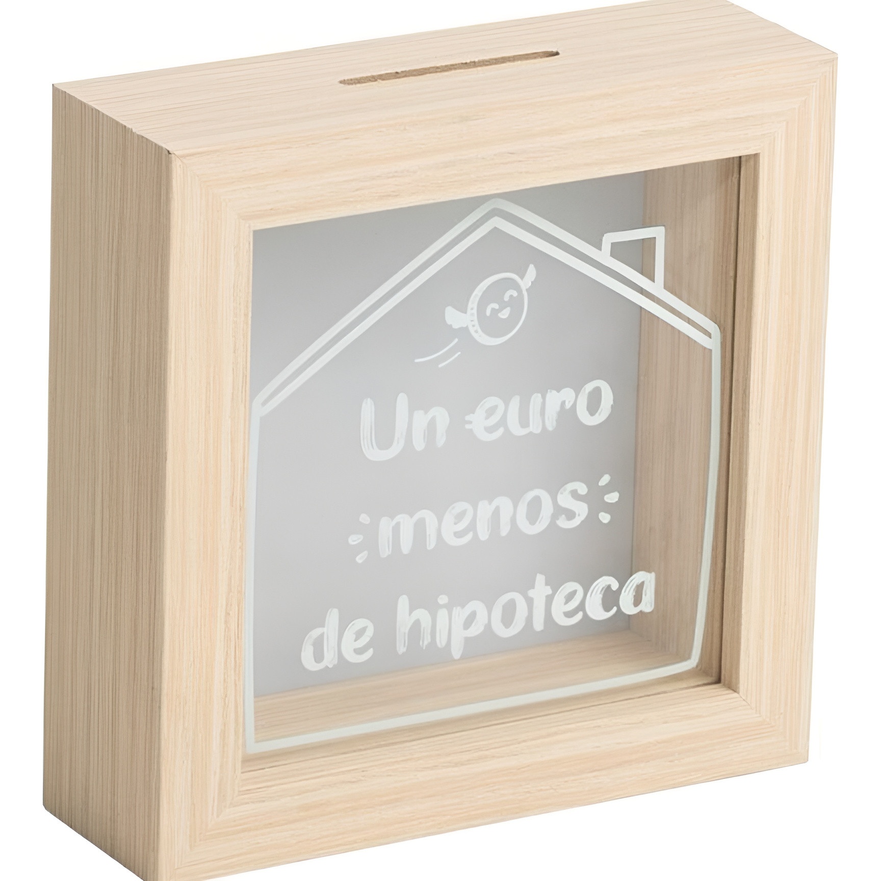 Mealheiro com frente transparente e a frase "Um euro a menos na hipoteca". Concebido para mostrar a poupança à medida que cresce, criando um elemento visual e motivador. Ideal para oferecer na inauguração da casa ao senhor / à senhora que acabou de mudar-se, ou como objeto decorativo simples e original. Dá um toque descontraído e prático a qualquer recanto do lar.