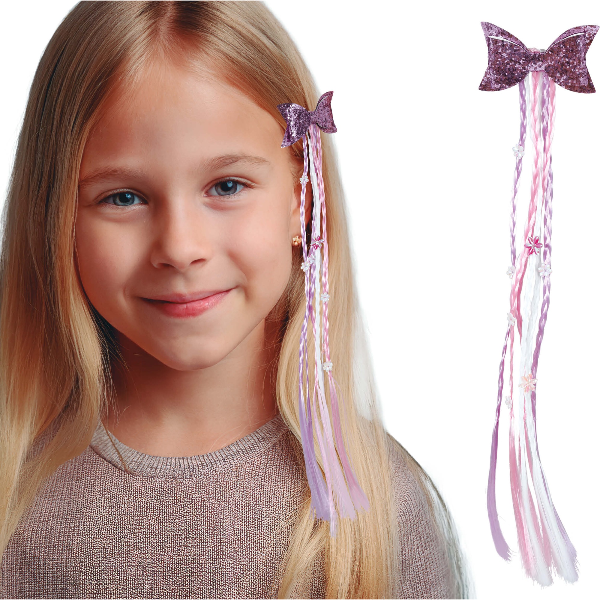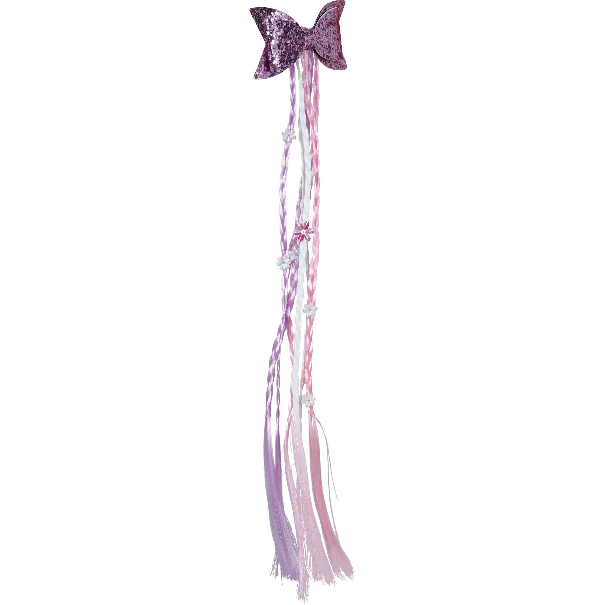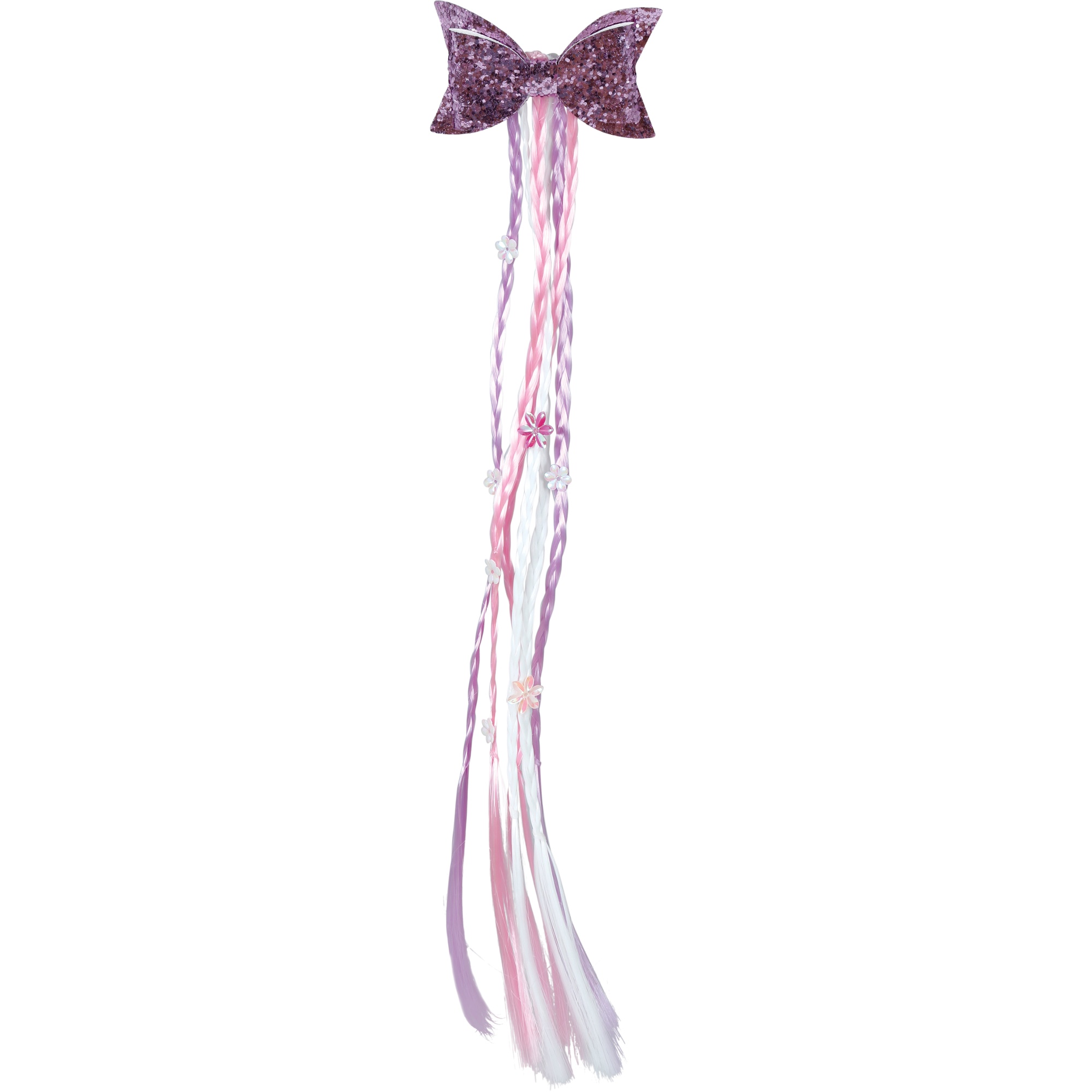 Mecha de tranças em tons lilás e rosa com um laço brilhante, 30 cm de comprimento para um efeito vistoso no cabelo.