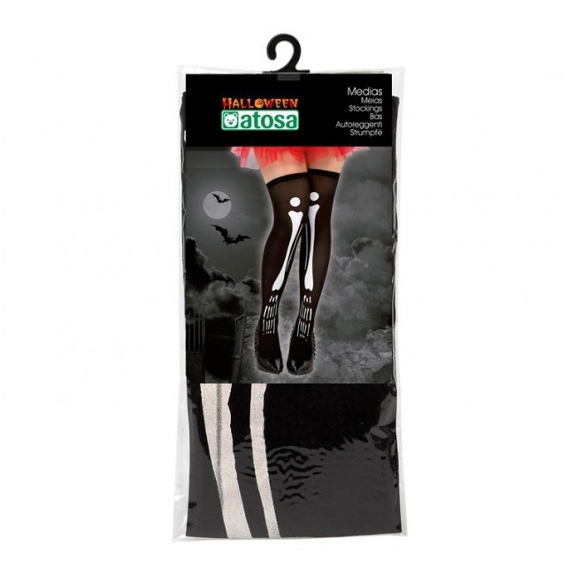 Estas meias originais destacam-se pelo seu estampado com ossos de esqueleto correspondentes à perna em branco sobre o tecido preto da meia. Graças ao contraste entre as duas cores, as meias criam a ilusão de que os ossos impressos estão no ar, como um esqueleto real.