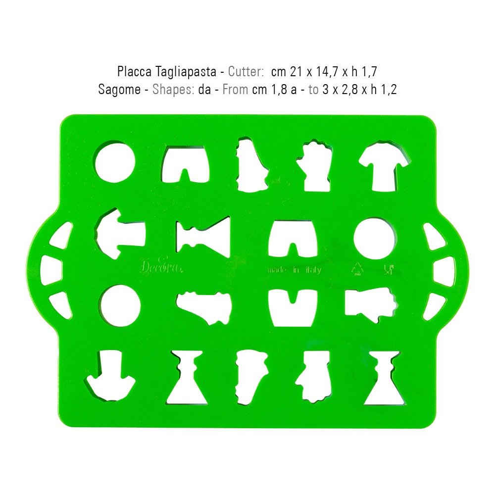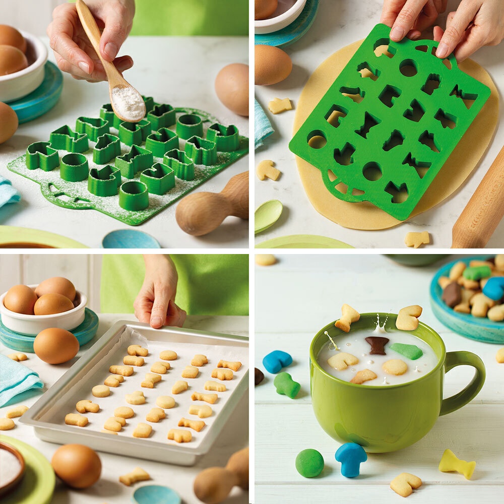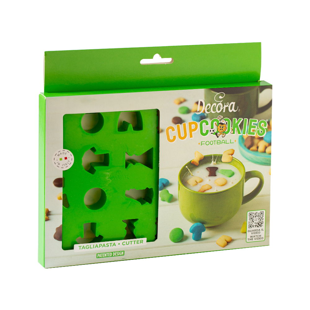 - Um cortador com vários formatos e alças laterais práticas, perfeito para preparar biscoitos pequenos com tema de futebol.