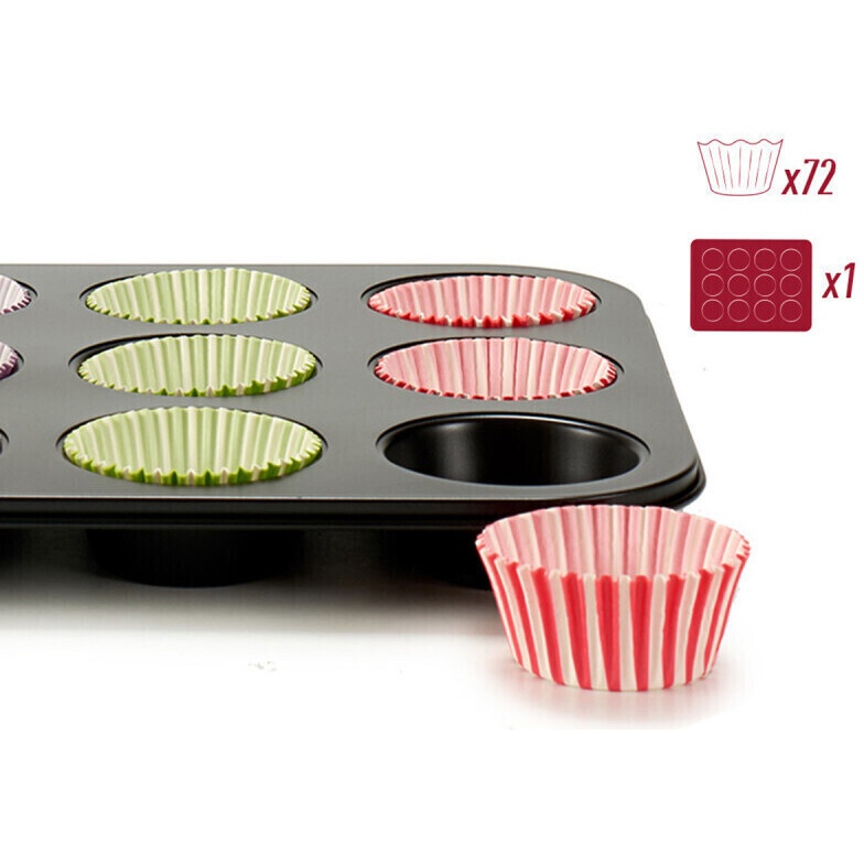 - Inclui 1 molde e 72 cápsulas sortidas para queques.