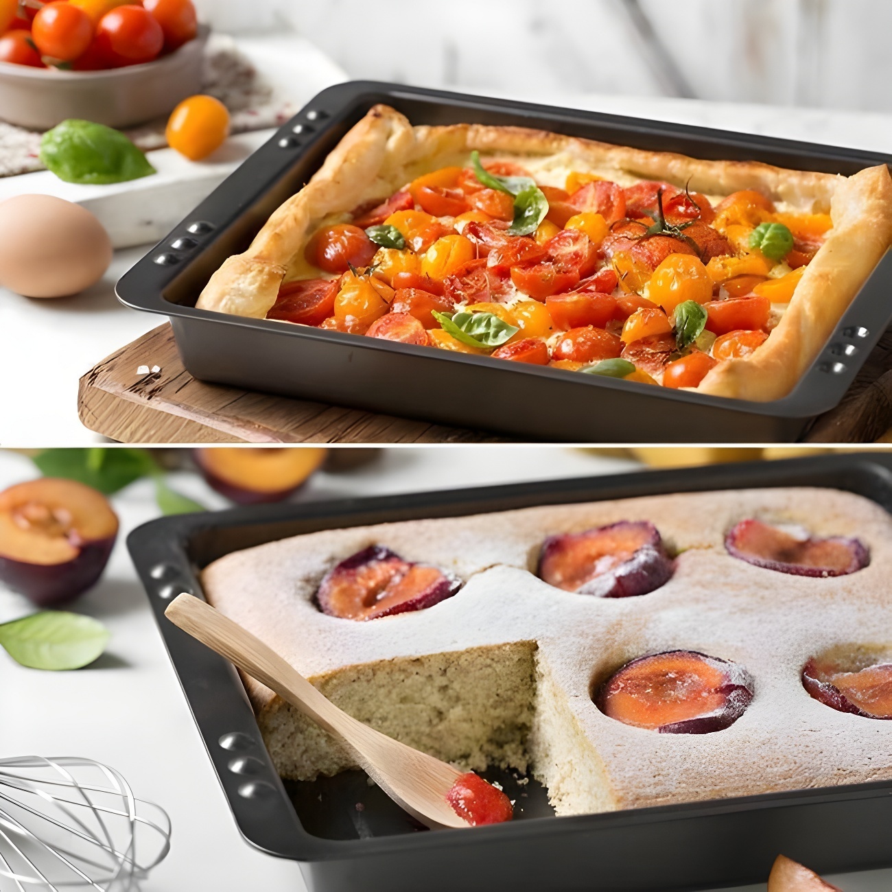 Forma ideal para receitas doces e salgadas. Os pequenos orifícios nas pegas do molde permitem-lhe sobrepor outro igual, utilizando-o como tampa.