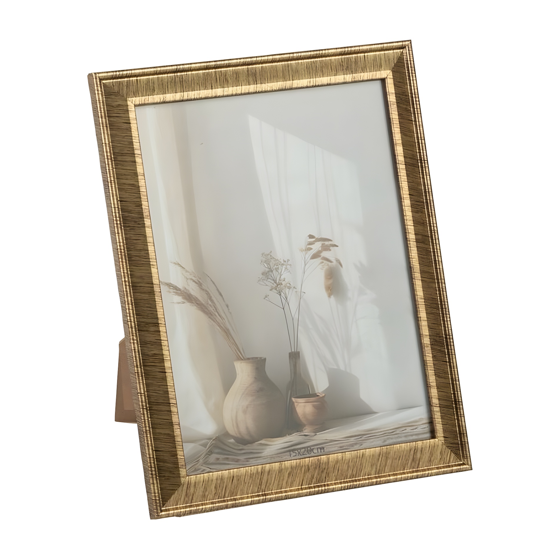 Moldura porta?foto com acabamento dourado envelhecido que oferece um toque elegante e nostálgico a qualquer ambiente. Perfeita para realçar retratos e recordações familiares com um estilo clássico.