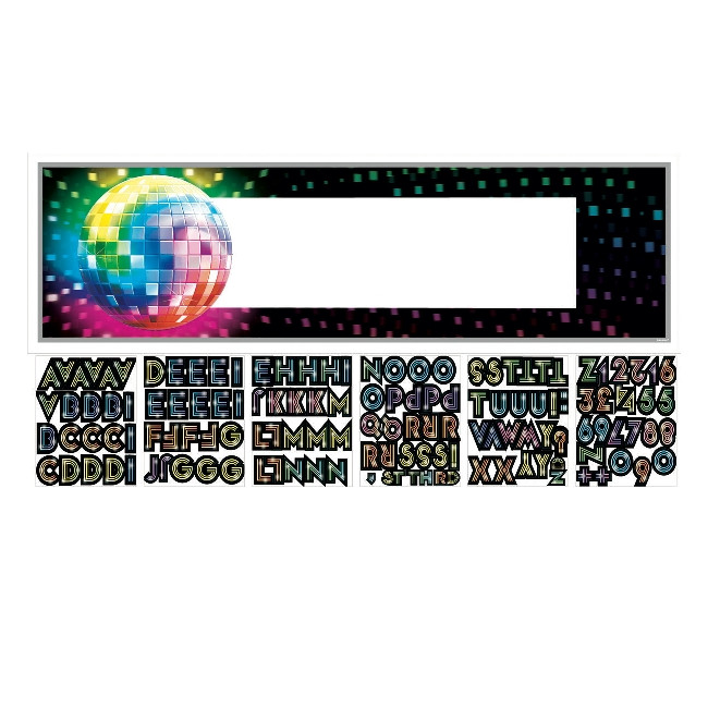 Faça com que os seus convidados sintam a nostalgia dos anos 70 e 80 com este mural de plástico, decorado com uma bola de discoteca a cores sobre um fundo preto. Tem um espaço reservado para texto personalizável, incluindo 120 letras e números adesivos num tipo de letra disco.