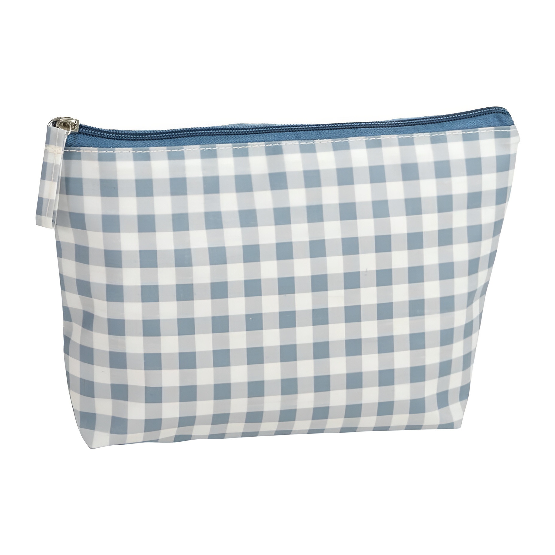 Necessaire compacto e leve com estampa vichy azul, pensado para manter os seus itens organizados com estilo.