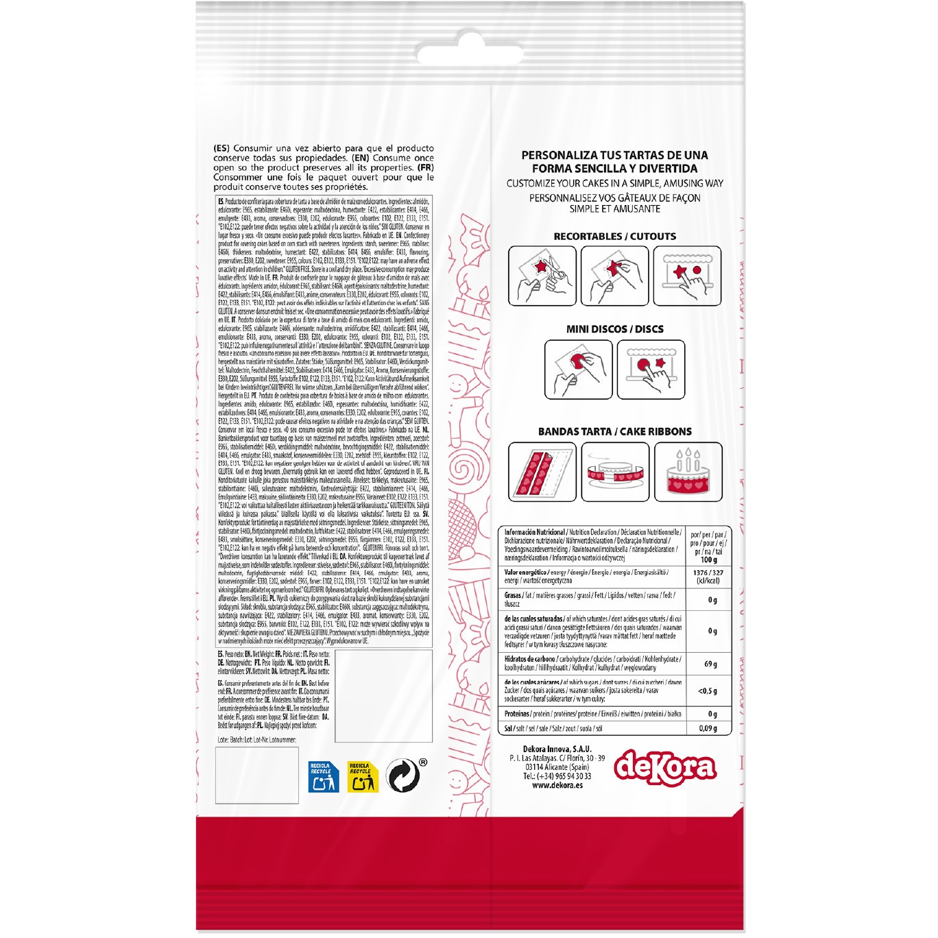 Ingredientes: Amido, aroma, humectante (E422), emulsificantes (E433), estabilizantes (E414, E460i, E466), conservantes (E202, E330), edulcorantes (E955, E965), espessante (maltodextrina), corantes (E102, E122, E133, E151).