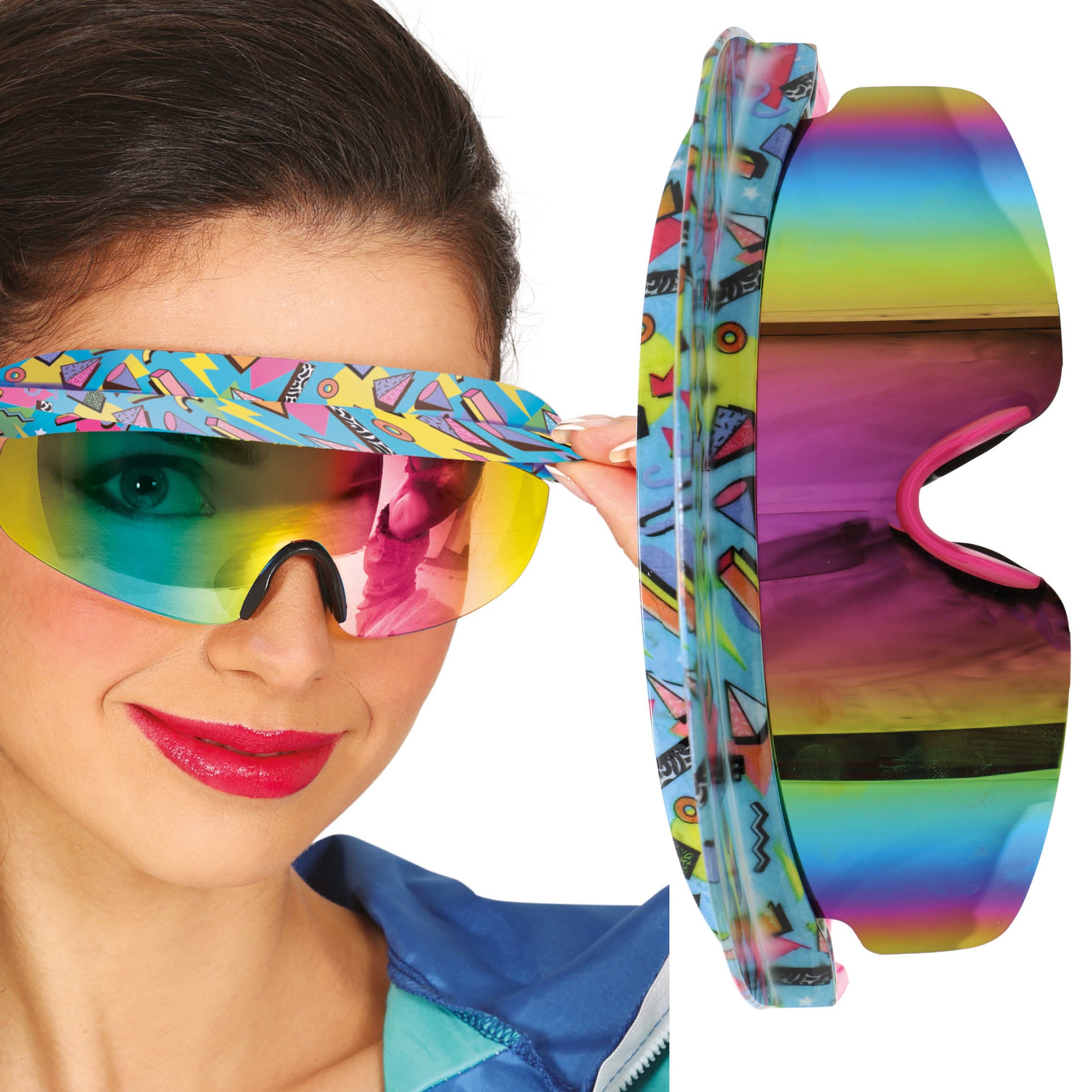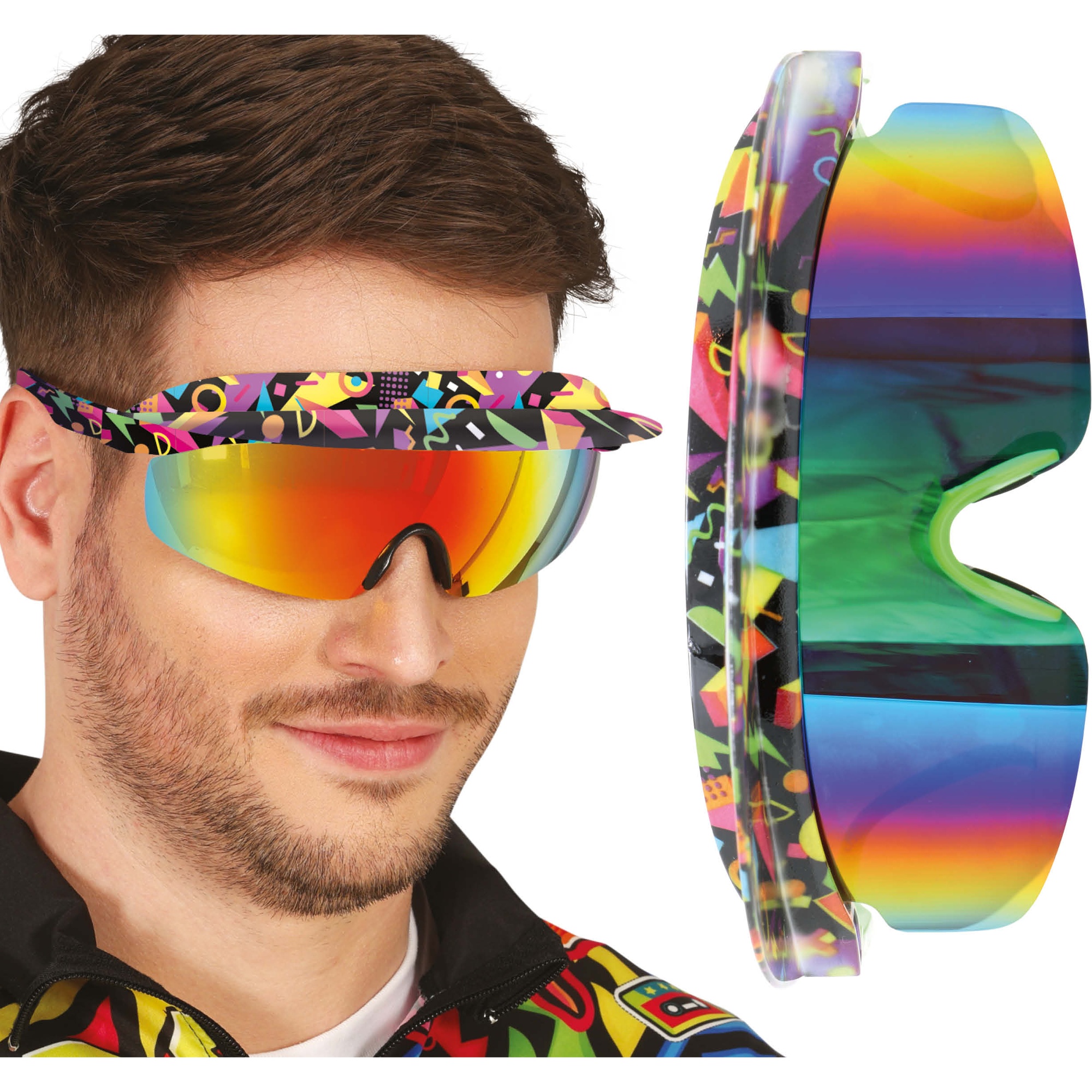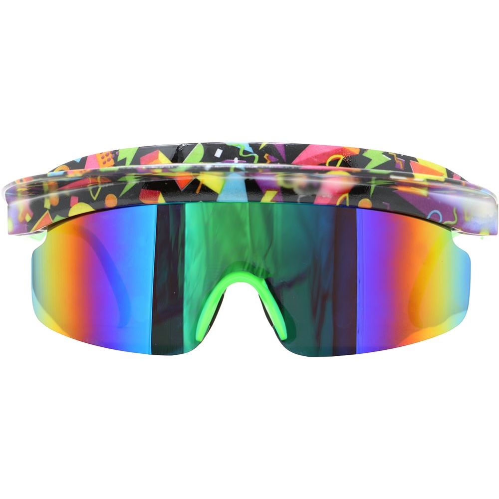 Óculos anos 80 com design de visor esportivo e lente espelhada de cores intensas. A armação envolvente confere um visual dos anos 80 imediato e muito chamativo. Possuem correia elástica ajustável para um ajuste seguro e confortável. Leves e ergonômicos, pensados para usar por horas sem incômodo. Ideais para o senhor/a senhora que procura um acessório retrô com presença.