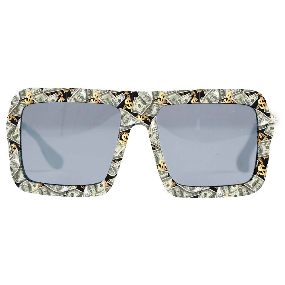 Óculos com estampa de notas e design arrojado que imita cédulas, conferindo um toque divertido e original ao seu visual. A armação retangular e as lentes fumê criam um ar moderno e vistoso. Fabricados em PVC leve para um uso confortável durante longas celebrações. Um complemento pensado para sobressair em festas, Carnaval e sessões fotográficas.