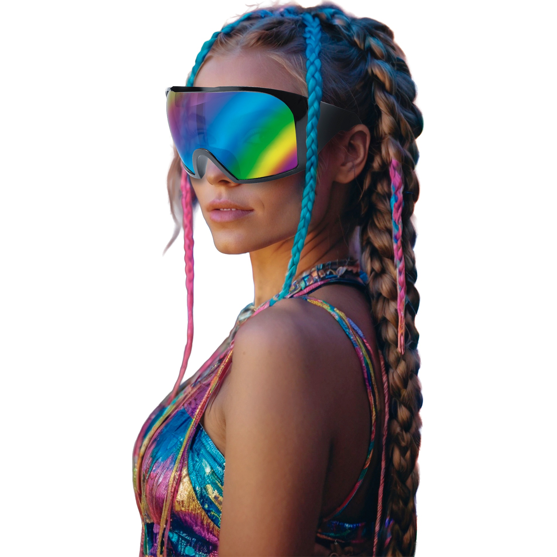 Óculos futuristas com lente espelhada multicolor de grande impacto visual. O seu design panorâmico e curvo cria um efeito cyber e contemporâneo que valoriza qualquer look criativo. Armação leve em PVC e tira elástica larga que proporciona um ajuste confortável e estável para si. A lente refletora muda de tonalidade conforme a iluminação, oferecendo um resultado dinâmico em fotografias e espetáculos. Acessório marcante pensado para destacar em eventos, sessões fotográficas e outfits de grande impacto.