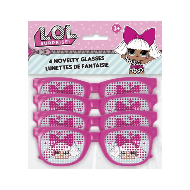 Divertidos óculos de plástico com armação cor-de-rosa para oferecer na sua festa de aniversário baseada nas novas bonecas LOL Surprise e para surpreender os seus amigos.