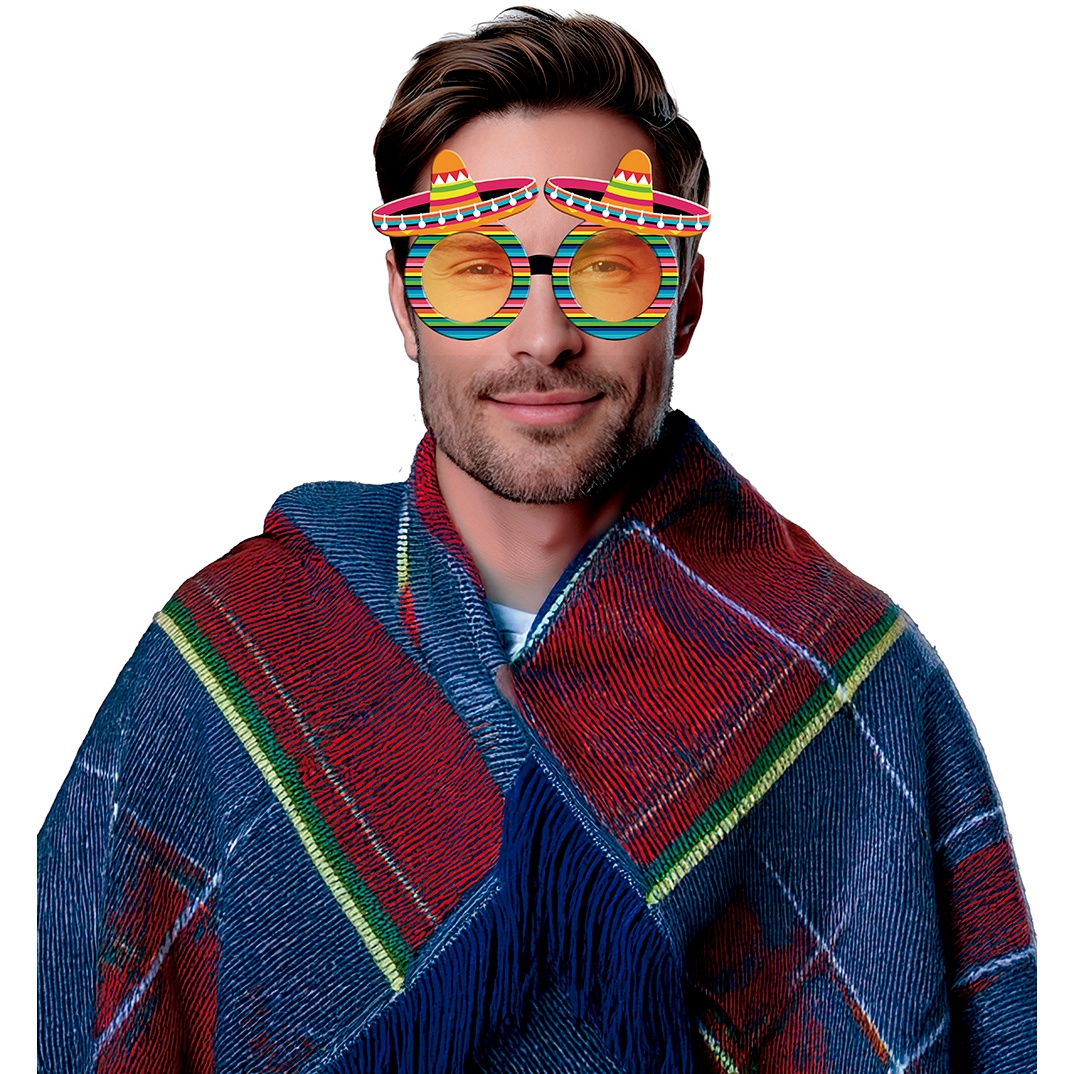 Óculos mexicanos de design festivo com armação multicolor e mini-sombreros integrados. Proporcionam um toque arrojado e divertido a qualquer look de festa ou photocall. Fabricados em PVC leve para maior conforto durante horas. Design unissexo, pensado para o senhor/a senhora e para crianças.