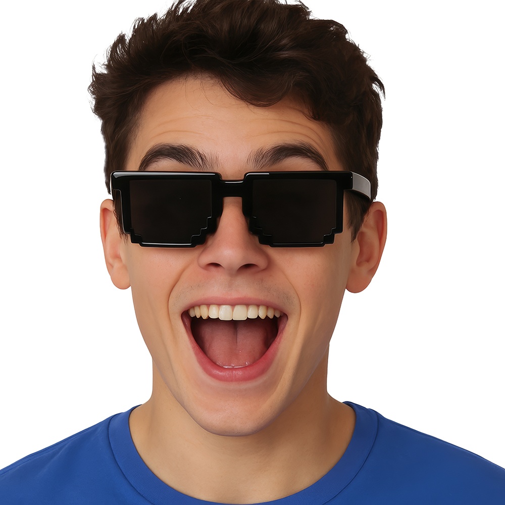 Óculos Pixel pretos com estilo 8-bit divertido, perfeitos para animar suas festas e photocalls.