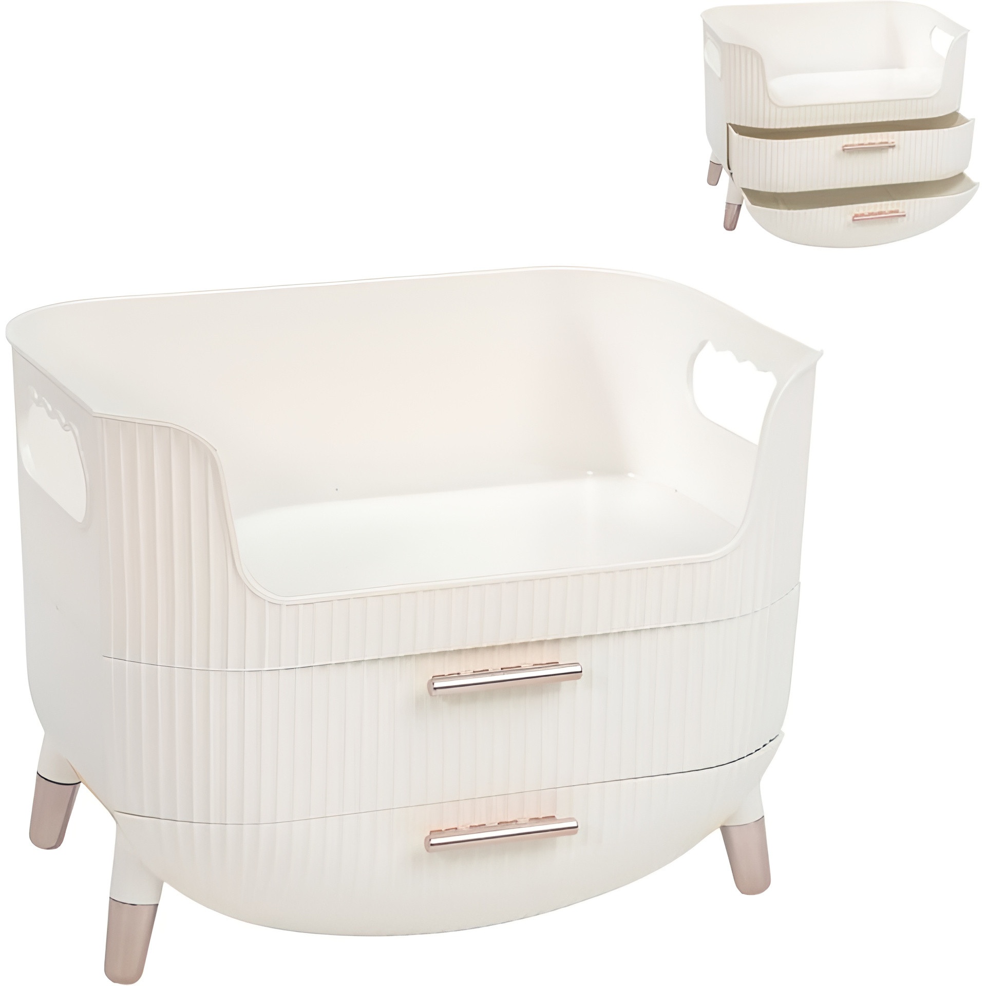 - Alças laterais integradas para transporte confortável e prático entre ambientes.
