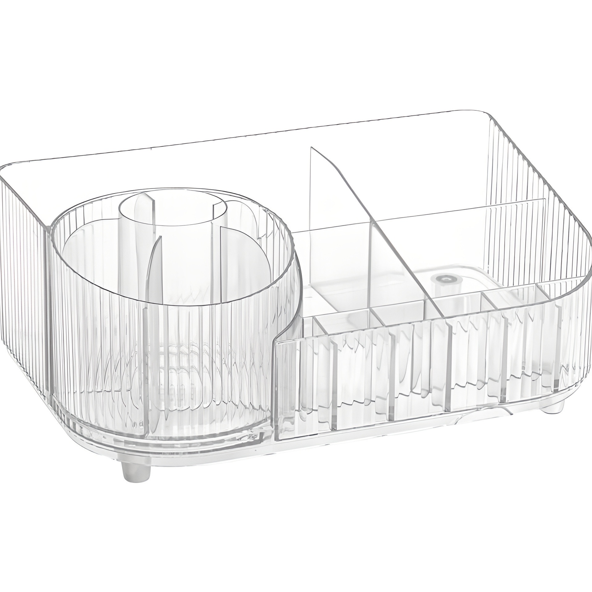 Os seus compartimentos variados permitem classificar os produtos por tipo e tamanho, enquanto o porta-pincéis central mantém os pincéis na posição vertical para um acesso rápido. O design compacto e translúcido maximiza o espaço da penteadeira sem abrir mão do estilo.