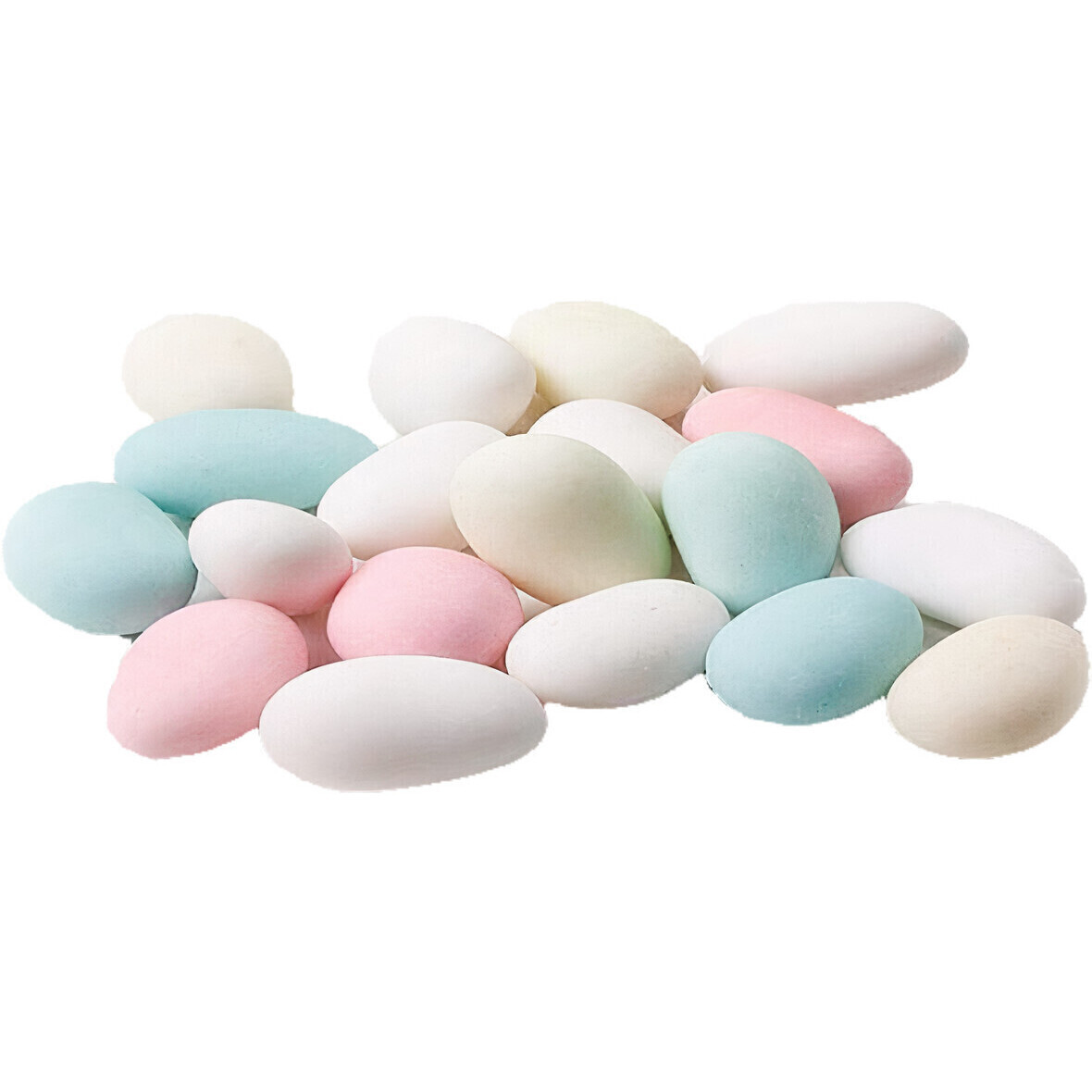 Ingredientes: cobertura de açúcar (85%), (açúcar, farinha de arroz, xarope de glucose, amido de arroz, agente de revestimento: goma arábica, corantes: E100, E120, E132) e amêndoas (15%).