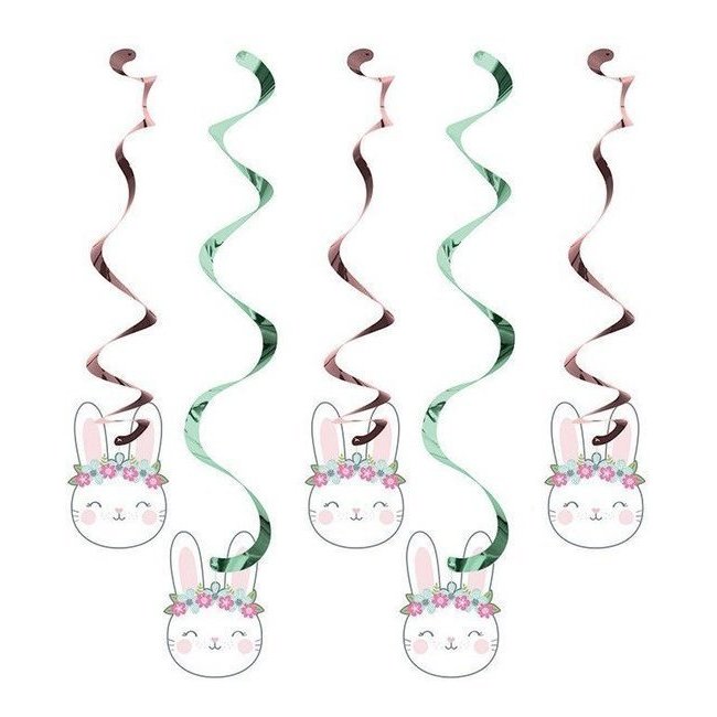 Conjunto de 5 pendentes com tiras de cores diferentes. Na extremidade de cada tira está pendurado um divertido coelhinho, fácil de incorporar na decoração da sua festa.