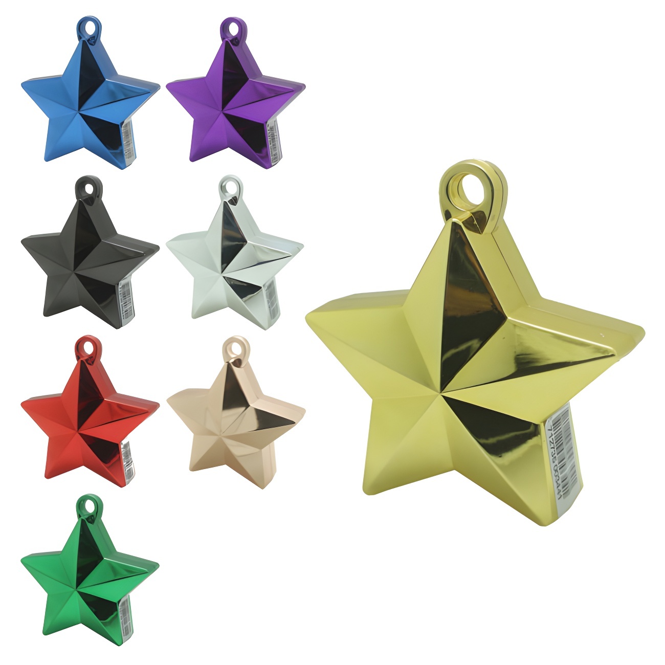 Peso para balões em forma de estrela de 150 gramas. É feito de plástico rígido e tem uma argola numa das extremidades para prender a fita e atar o balão para que este não rebente se o encher com hélio.