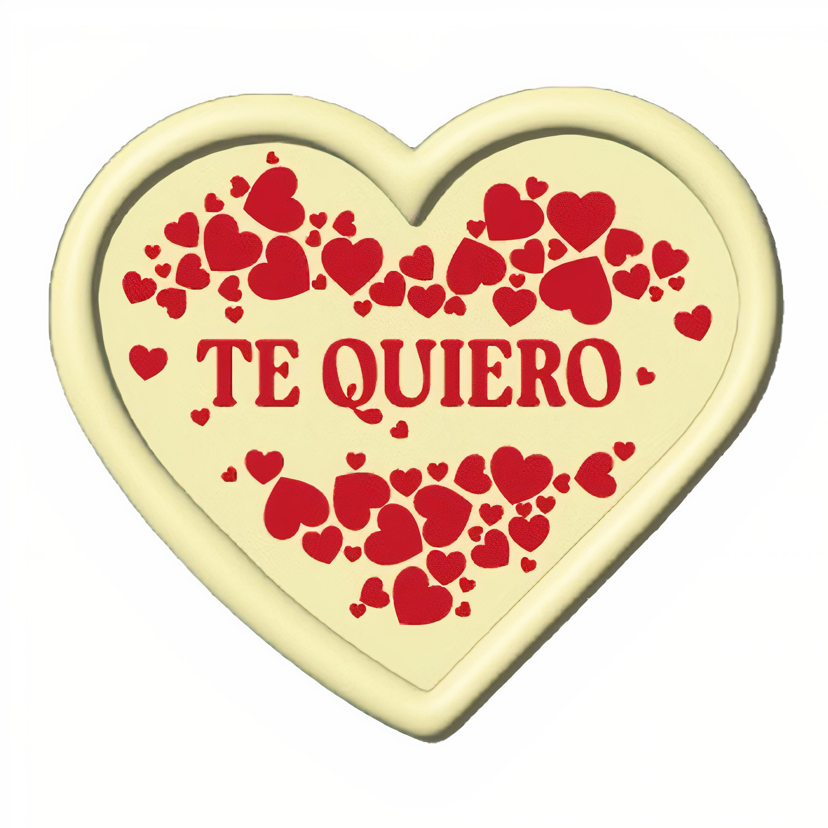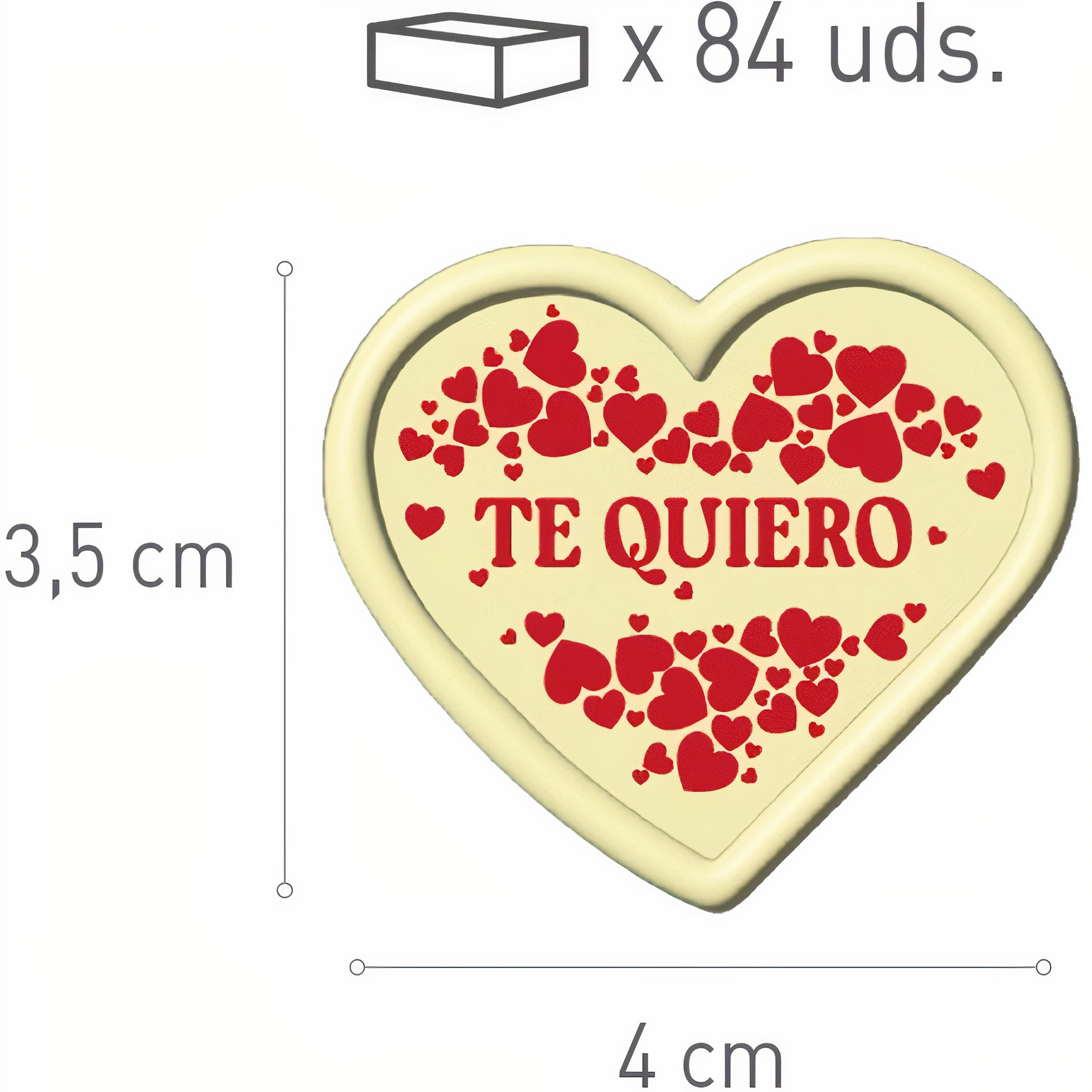 - 84 placas de chocolate branco em forma de coração com a mensagem "TE QUIERO".