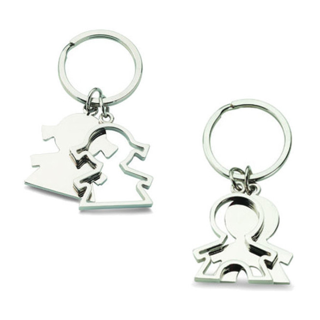 Um bonito porta-chaves em metal com uma silhueta dupla que pode escolher entre menino ou menina. Apresentado numa caixa preta opaca.